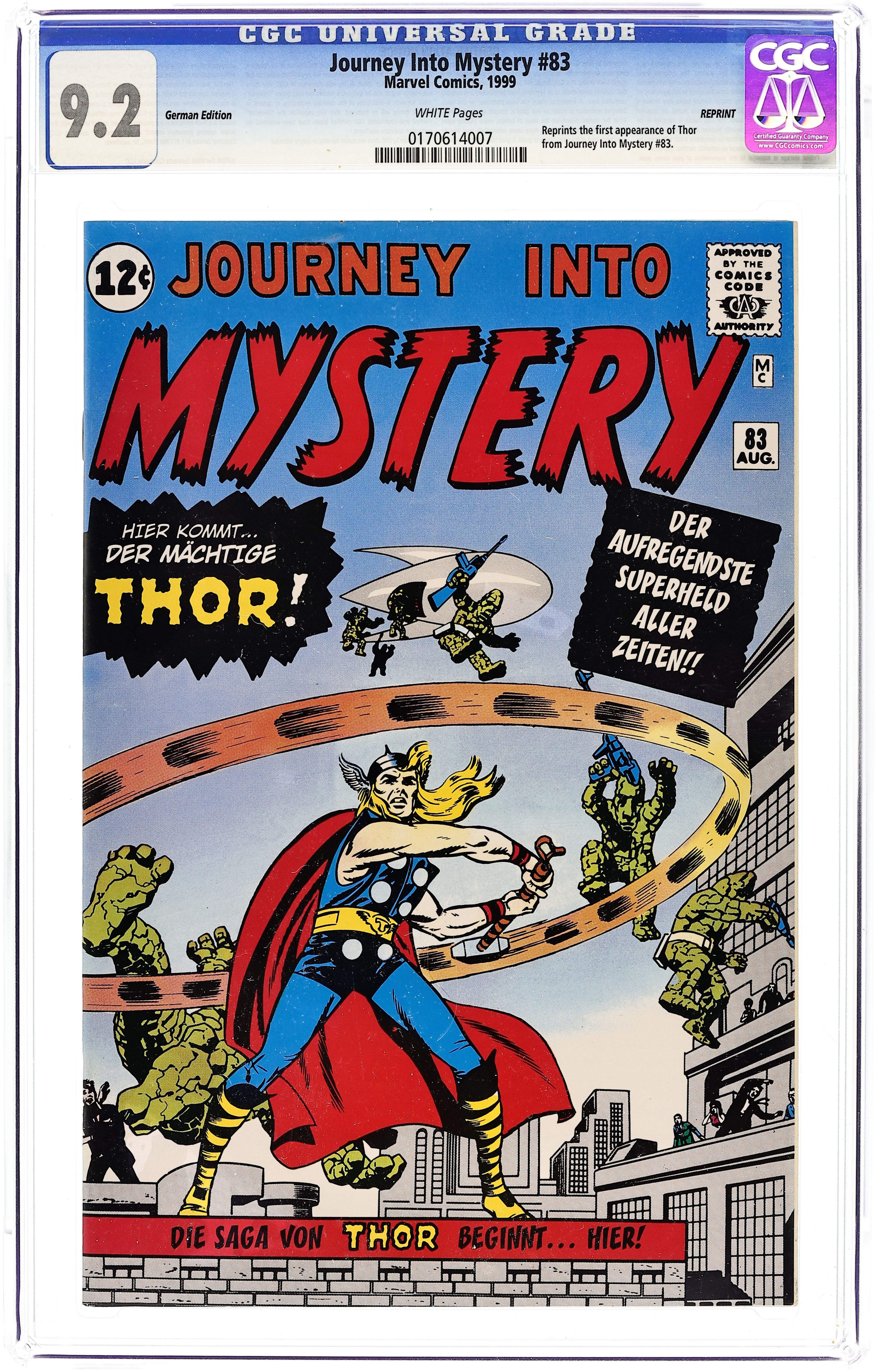 Reprints the original Journey Into Mystery #83 in German. Distributed as an exclusive bonus comic in a foreign comic multi-pack (Marvel Jubiläum Pack 8) with four other Marvel Deutschland comics. Cover pencils by Jack Kirby, inks by Joe Sinnott. First appearance and origin of Thor in "The Stone Men from Saturn!," script by Stan Lee (plot) and Larry Lieber (script), pencils by Jack Kirby, inks by Joe Sinnott; A lame doctor vacationing in Norway runs across an alien invasion; While hiding from the aliens in a cave he finds an old cane that transforms him into the god Thor; Thor drives back the alien invasion. "Discovery" two-page text story, art by Joe Maneely. "The Perfect Crime," script by Stan Lee, art by Don Heck; A crook tries to kill and rob a man by pushing him off a cliff, but finds that he is a flying man from Mercury. "When the Jungle Sleeps," script by Stan Lee, art by Steve Ditko; A lion is given superhuman intelligence by a nuclear test; It plans to attack humanity, but quickly loses its enhanced intelligence. Cover price $0.12.