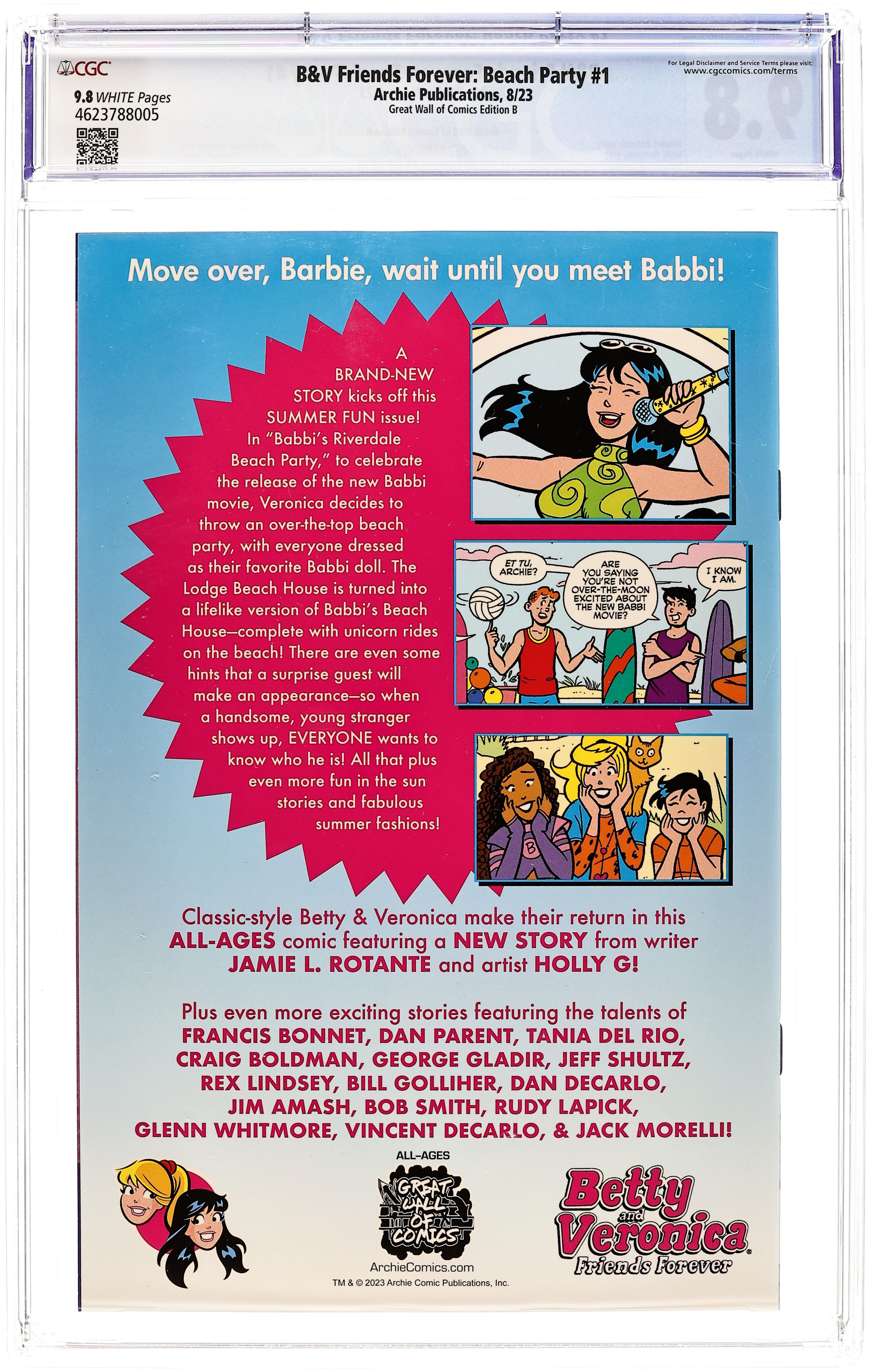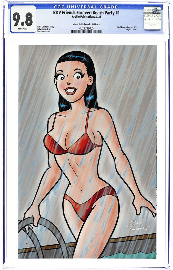 Great Wall of Comics Exclusive Variant Cover by Dan Parent. Cover homage to 3-D Zone (1986) #16. Written by Tom DeFalco. Art by Jim Amash, Steven Butler and VARIOUS. BRAND NEW STORY: Chaos reigns when Betty and Veronica's plans for a tranquil girls' night with a few friends are ruined by Archie and a team of boisterous Little Leaguers! Plus, even more fun-in-the-sun stories! 32 pages, full color.