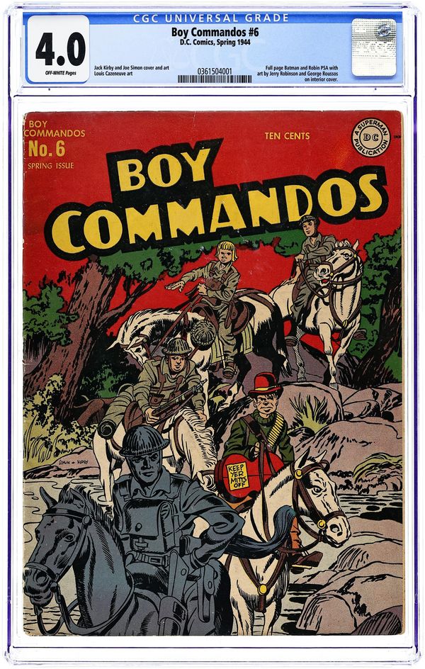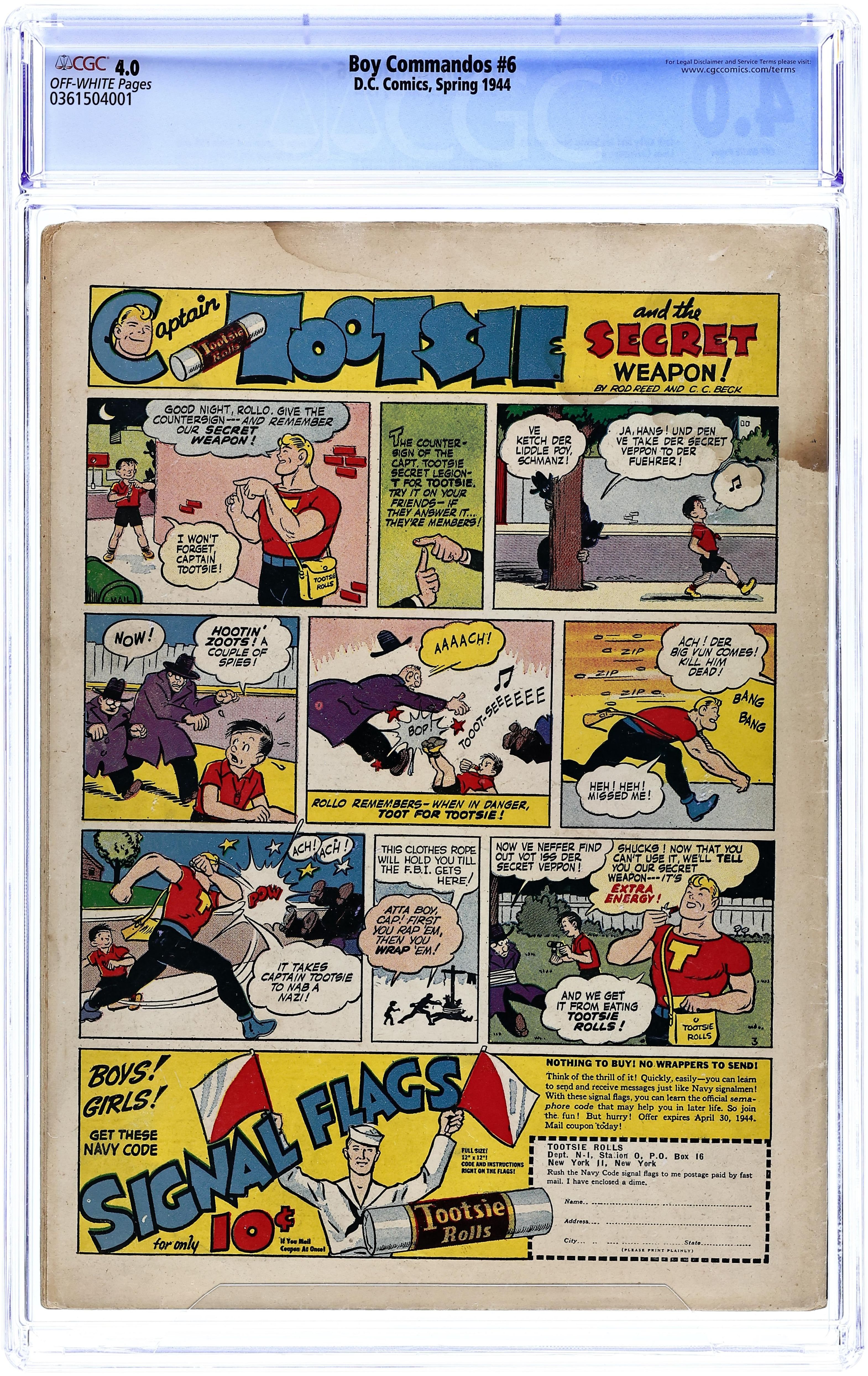 World War II cover. Cover pencils by Jack Kirby, inks by Joe Simon. Paper drive public service announcement starring Batman, script by Jack Schiff, pencils by Jerry Robinson, inks by George Roussos. News From Belgium, pencils by Jack Kirby, inks by Joe Simon; the commandos deliver a newspaper press to the Belgian underground. The Jackals of Jawnpore!, pencils by Jack Kirby, inks by Joe Simon; the commandos assist an India rajah in his efforts to control crime in his city. Action Along the Adriatic!, art by Louis Cazeneuve [ghosting for Jack Kirby]; the commandos go on a mission to aid partisans in the Balkans. Captain Tootsie and the Secret Weapon! ad for Tootsie Rolls, art by C.C. Beck. 52 Pages, Full Color. Cover price $0.10.