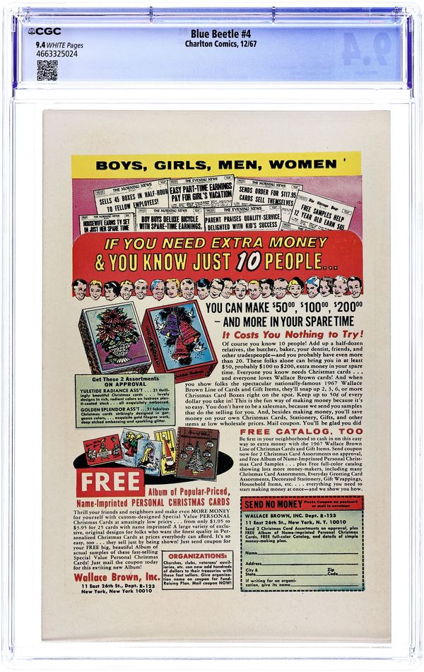 Cover by Steve Ditko. Stories and art by Steve Ditko, David Charles Glanzman and Dick Giordano. The third (or fourth, depending on how you count it) Charlton series to feature the Blue Beetle introduces the Silver Age BB, Ted Kord. The origin of the new Blue Beetle is revealed, as well as his connection to Dan Garrett, the Golden Age Blue Beetle. (Both heroes inspired characters in Alan Moore's Watchmen, as did The Question.) The faceless crimefighter The Question must find a way to silence the sinister Banshee. The End Is a Beginning!; The Question vs. the Banshee. 32 pages, Full Color. Cover price $0.12.