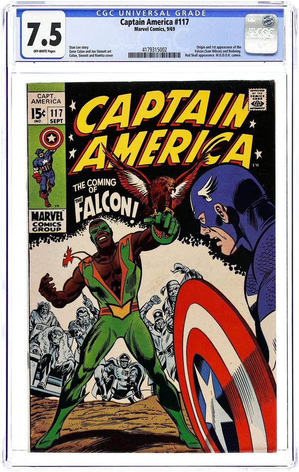 Cover pencils by Gene Colan and John Romita (alterations), inks by Joe Sinnott and John Romita (alterations). First appearance and origin of the Falcon in "The Coming of... the Falcon!", script by Stan Lee, pencils by Gene Colan, inks by Joe Sinnott; With the Red Skull previously having switched bodies with Captain America, the Skull uses the Cosmic Cube to send Cap to the tropical island home of the Exiles; There Cap encounters a falconer from Harlem who had been hired by the Exiles but who is now attempting to help the island natives kick the Exiles from their home; Cap joins forces with the falconer who, with Cap's urging, dons a costume and takes the name the Falcon. Letter to the editor from writer James Van Hise. 36 pgs., full color. $0.15. Cover price $0.15.