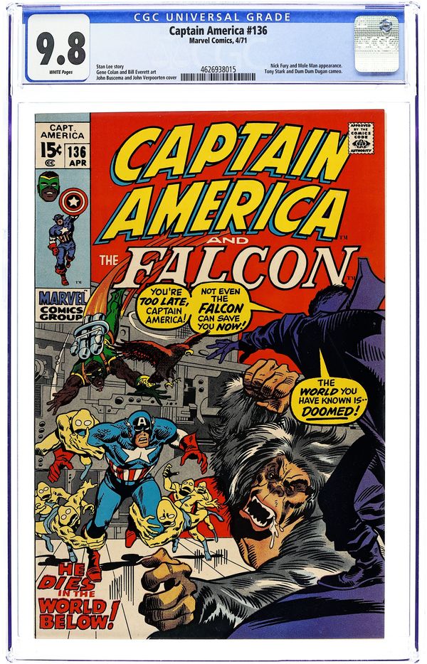 Cover pencils by Gene Colan and John Romita (alterations), inks by Joe Sinnott and John Romita (alterations). First appearance and origin of the Falcon in "The Coming of... the Falcon!", script by Stan Lee, pencils by Gene Colan, inks by Joe Sinnott; With the Red Skull previously having switched bodies with Captain America, the Skull uses the Cosmic Cube to send Cap to the tropical island home of the Exiles; There Cap encounters a falconer from Harlem who had been hired by the Exiles but who is now attempting to help the island natives kick the Exiles from their home; Cap joins forces with the falconer who, with Cap's urging, dons a costume and takes the name the Falcon. Letter to the editor from writer James Van Hise. 36 pgs., full color. $0.15. Cover price $0.15.