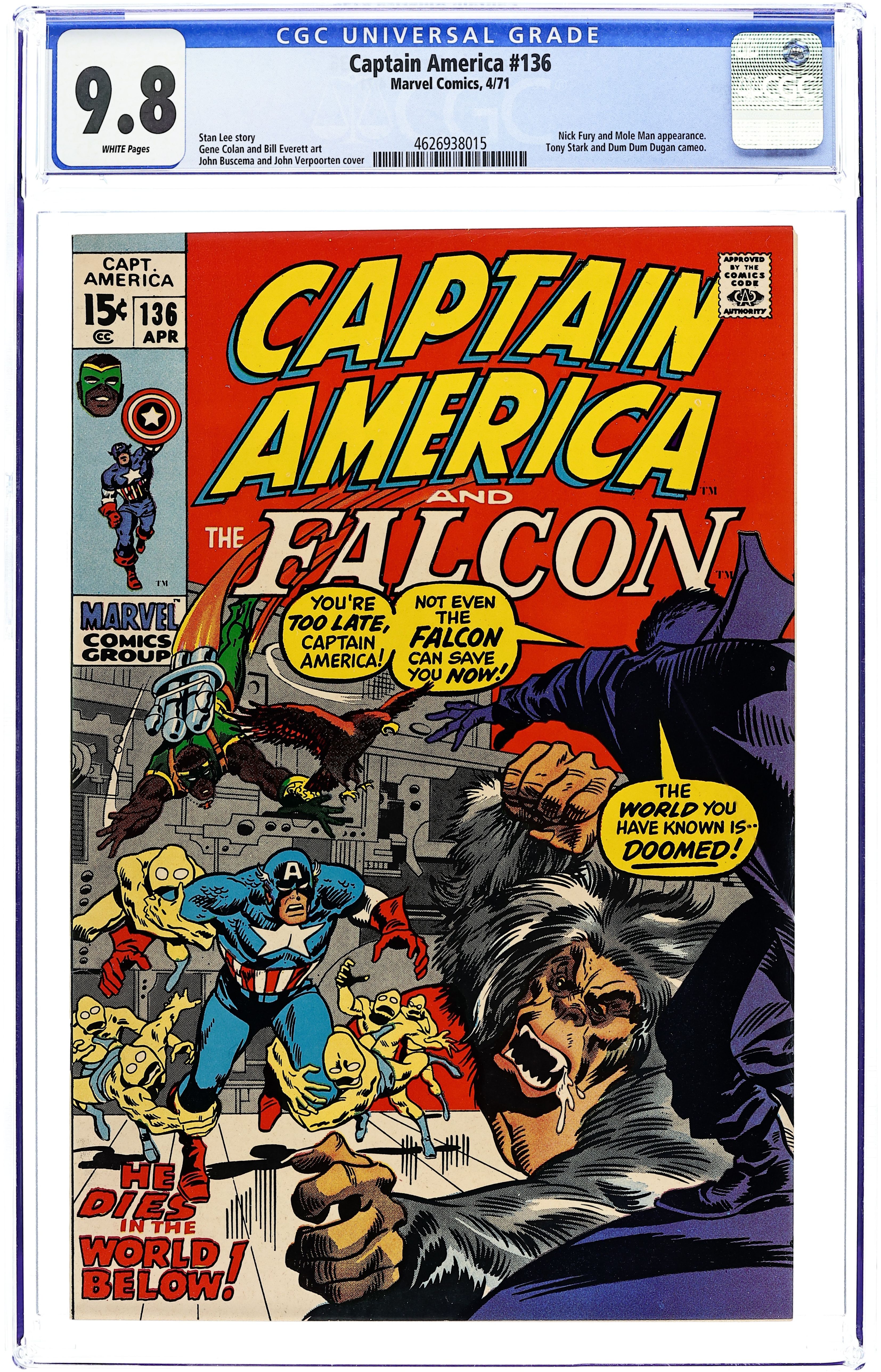Cover pencils by John Buscema, inks by John Verpoorten. The origin of the Mole Man is retold in "The World Below," script by Stan Lee, pencils by Gene Colan, inks by Bill Everett; SHIELD agents believe Captain America is dead after he and a huge gorilla (actually SHIELD biochemist Dr. Erik Gorbo) fall into a huge hole in the Earth; Their fall is slowed and halted by an anti-gravity beam wielded by the Mole-Man; Gorbo relates to the villain because they are both outcasts because of their appearance; The Mole-Man and his minions capture Cap and the gorilla; Gorbo dies, reverts to human, and confesses that he lied to start a war. Brief appearances by Nick Fury, Sharon Carter, and Tony Stark (Iron Man). The letters page contains a statement of ownership - average print run, 395,862; average paid circulation, 225,651. 36 pgs., full color. $0.15. Cover price $0.15.
