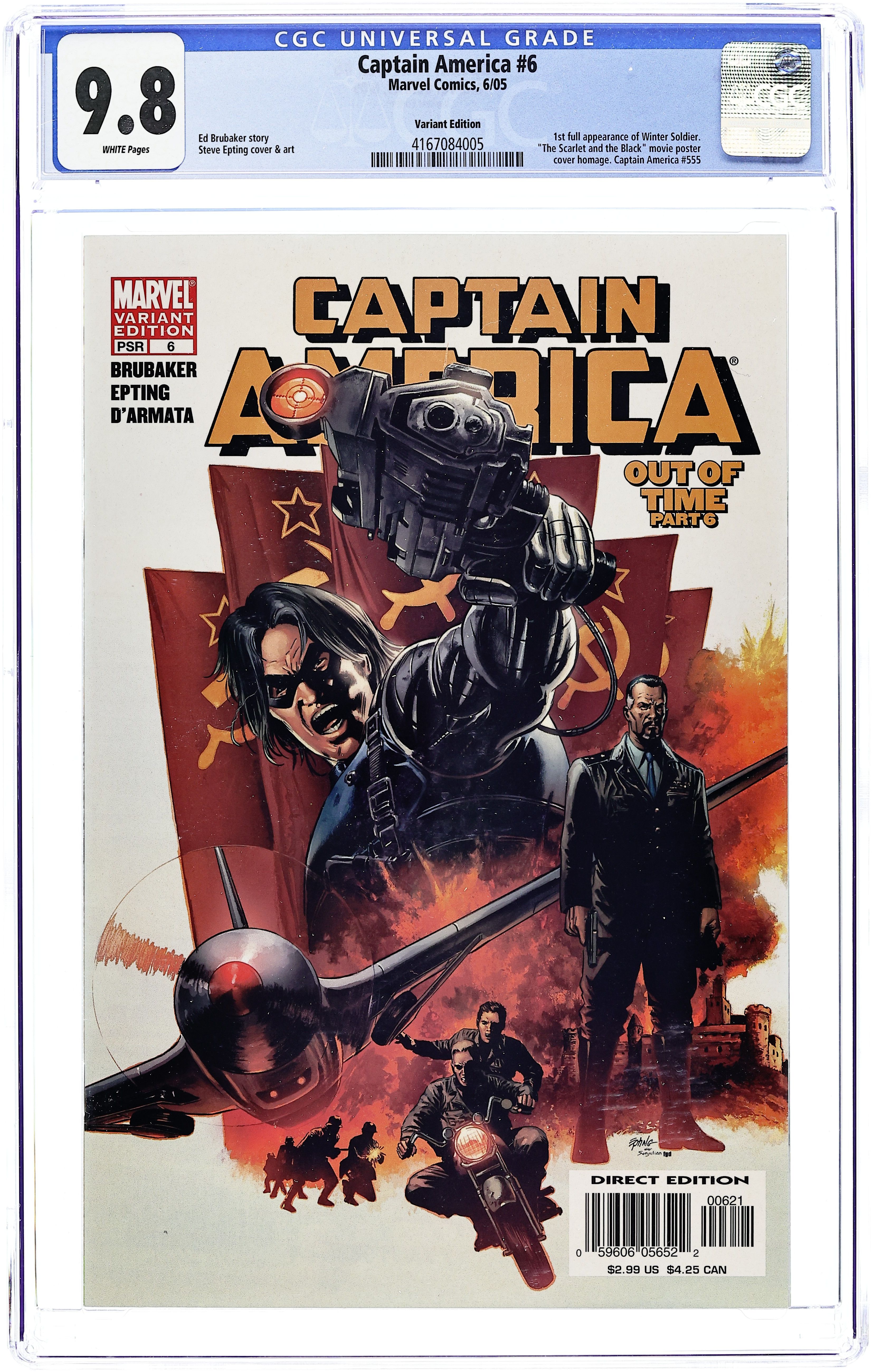 The Death of Captain America Act 1: Part 1 of 6 - Written by ED BRUBAKER Pencils STEVE EPTING Variant Cover by Ed McGuinness. Cover price $3.99.
