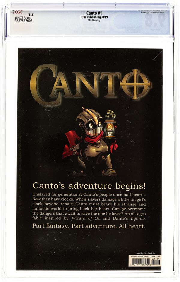 Retailer Incentive variant by Chris Ables. Written by David M. Booher. Art by Drew Zucker. Canto's adventure begins! Enslaved for generations, Canto's people once had hearts. Now they have clocks. When slavers damage a little tin girl's clock beyond repair, Canto must brave his strange and fantastic world to bring back her heart. Can he overcome the dangers that await to save the one he loves? An all-ages fable inspired by Wizard of Oz and Dante's Inferno. Part fantasy. Part adventure. All heart. 28 pages, full color. Cover price $3.99.