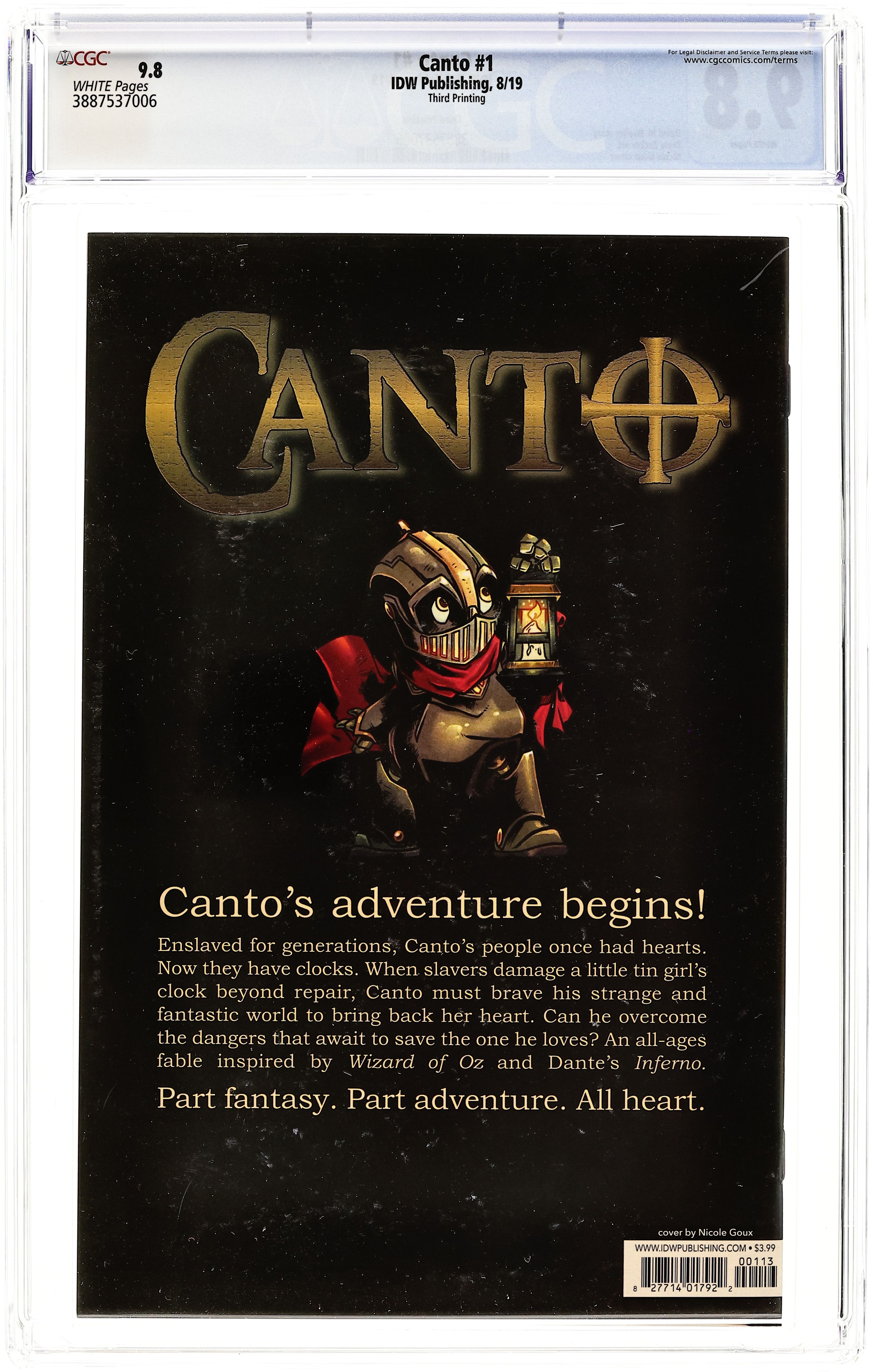 NOTE: The fading on the right side of the cover is intentional and part of the design of this homage to TMNT #1. Limited 1 for 10 Retailer Incentive Variant Cover. Written by David M. Booher. Art by Drew Zucker. Cover by Ben Bishop. Book 2 of all-ages fan favorite Canto begins! Once, a little tin slave with a clock for a heart broke all the rules-he found love, he was given a name, and he escaped his masters to go on an epic journey to save his love's heart. He met strange allies and terrifying enemies and, ultimately, though his adventure didn't turn out as planned, he returned to his people and led them to freedom. That freedom is in jeopardy when Canto discovers his people's clocks will stop unless they return to captivity. He and his friends Falco, Rikta, and Veratta embark on a new adventure to save the lives of all their people. Can they lift the curse before their time runs out? 28 pages, full color. Cover price $3.99.