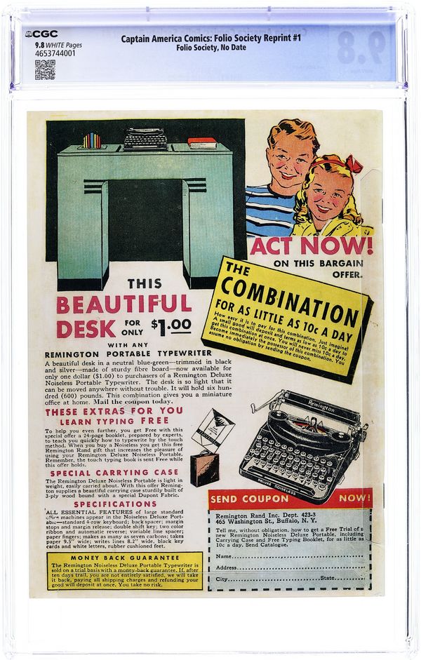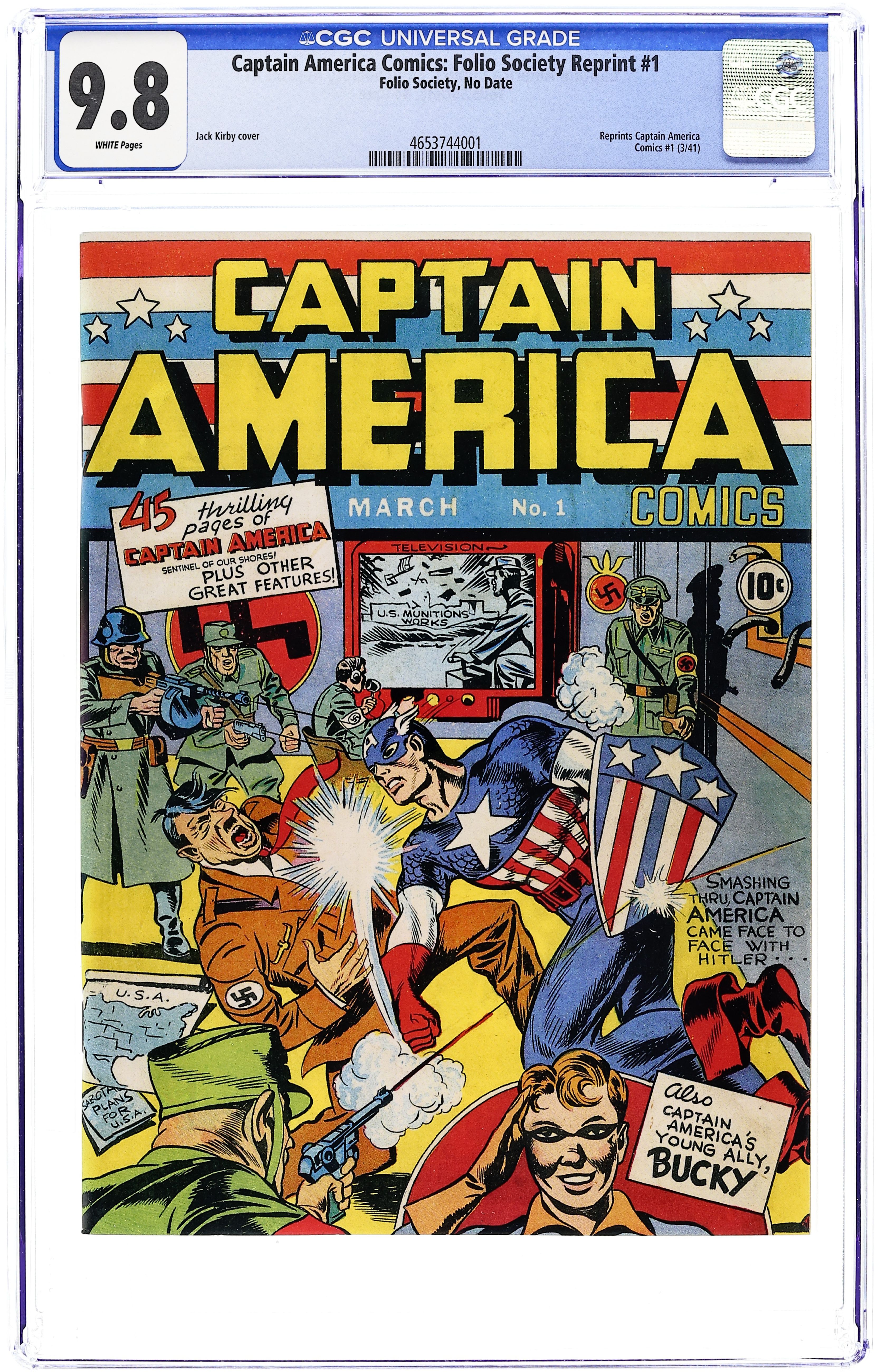Replica/ Facsimile Reprint Edition. Originally included in Folio Society's Captain America Hardcover. Reprints Captain America Comics (1941 Timely) #1. Cover by Jack Kirby. 68 pages. Cover price $0.10.