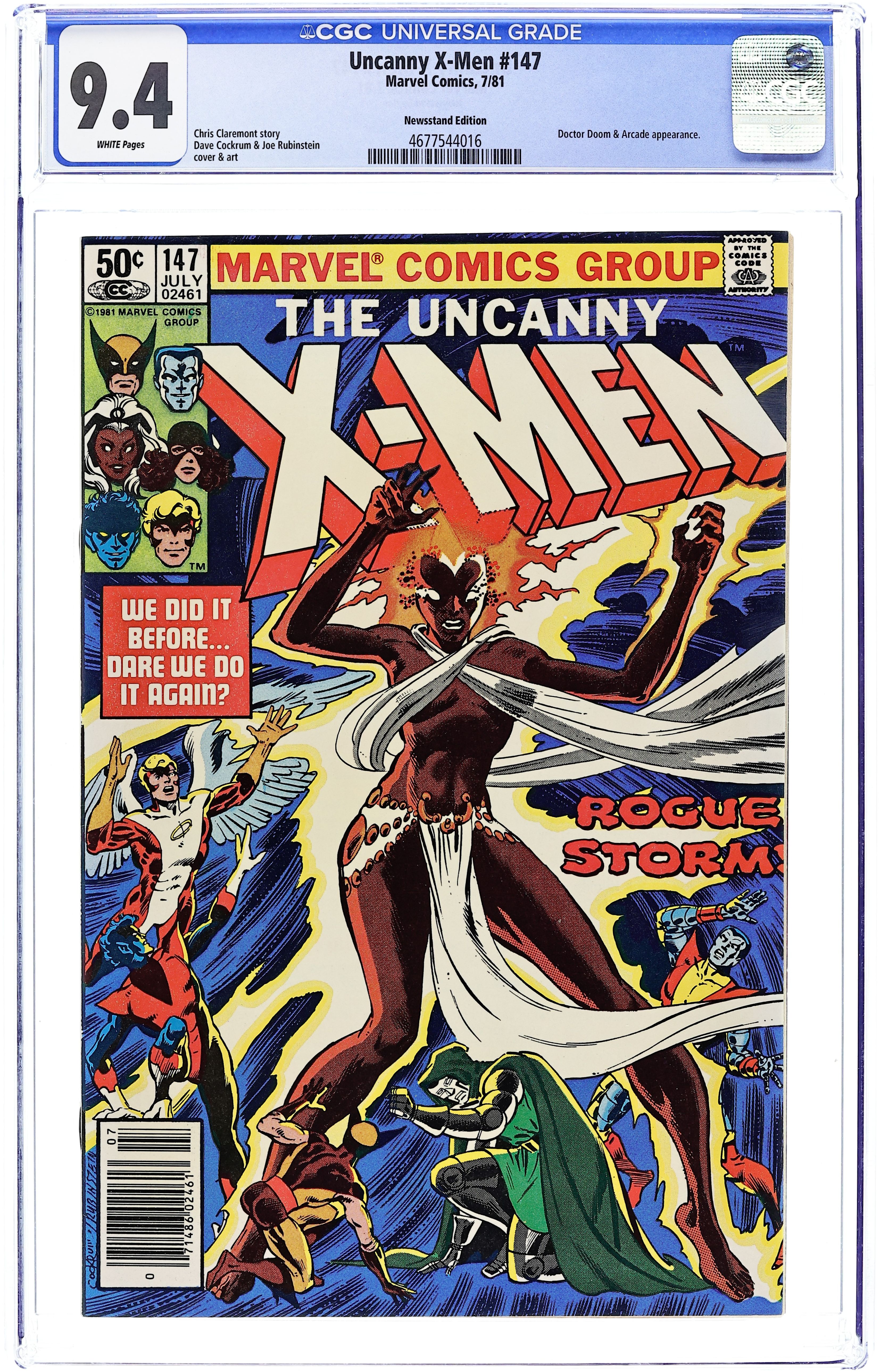 Newsstand Edition. "Rogue Storm!" Part 3 of 3. Story by Chris Claremont. Art by Dave Cockrum and Joe Rubinstein. It's the final showdown between the X-Men and the diabolical duo of Arcade and Doctor Doom. Witness the unbridled fury of Storm! Plus, Cyclops makes a startling discovery. 36 pgs. Cover price $0.50.
