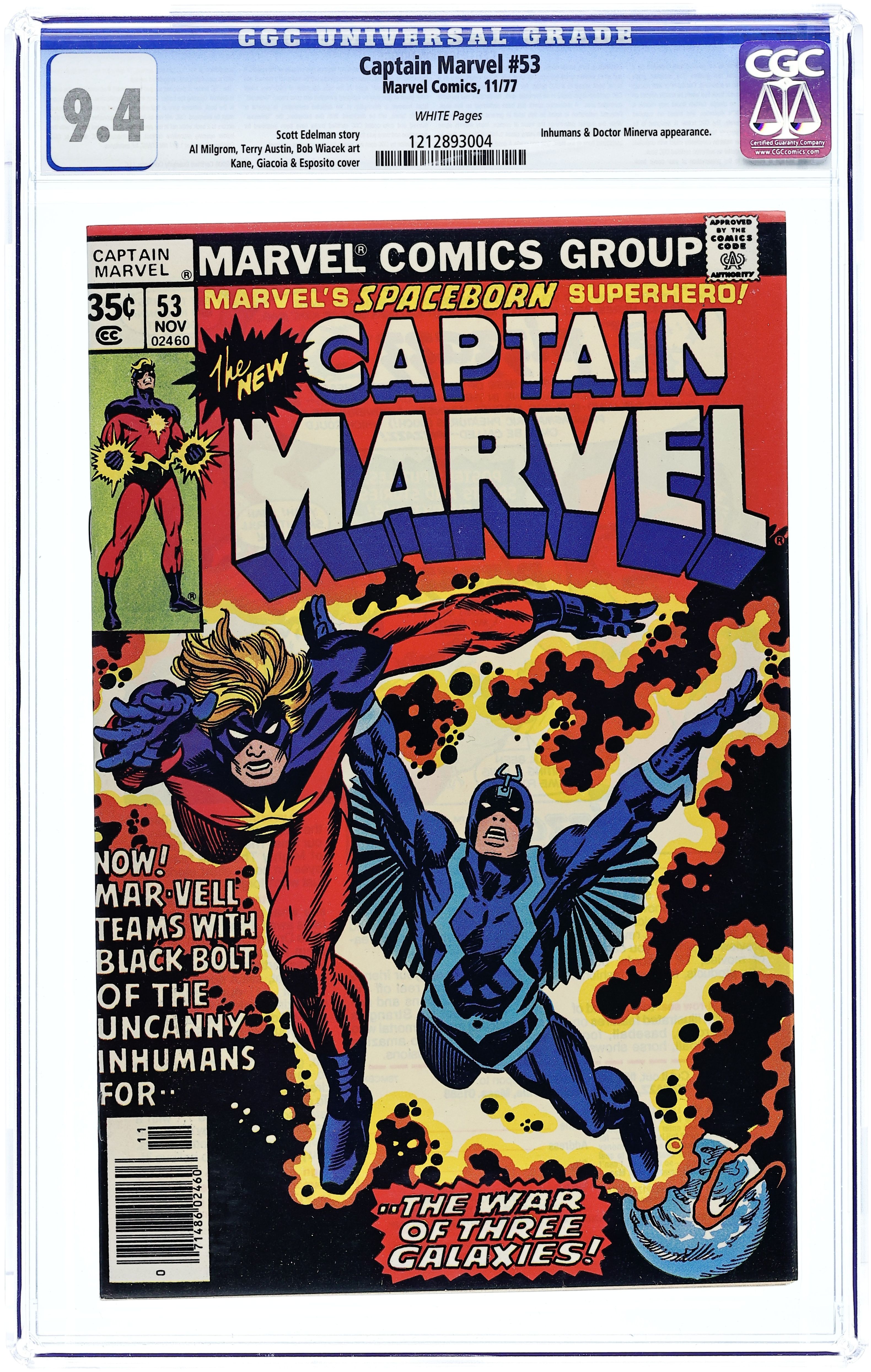 First 35-cent cover price. Cover pencils by Gil Kane, inks by Frank Giacoia. "The War Of The Three Galaxies!", script by Scott Edelman, pencils by Al Milgrom, inks by Terry Austin (pgs 1, 3-4, 6-7, 9-10); Bob Wiacek (pgs 2, 5, 8, 11-13, 15 and 16 upper tier); Jack Abel (page 14); and Al Milgrom (bottom tier pgs 16 and 17); Captain Marvel takes Doctor Minerva with him for questioning and gets intercepted by the Inhumans and the Kree castaway, Falzon; They pool their information and realize their recent struggles are all tied to the Kree's plans for the imminent War of Three Galaxies between the Kree and the Skrull, with Earth caught in the middle; Mar-Vell plans to use the Watcher's transporter to invade the heart of the Kree Supreme Science Council for answers and Black Bolt volunteers to go with him on what seems to be a suicide mission; Arriving in the Council's chambers just as Councilman Por-Bat is poised to give the word to launch all-out attack on the Skrulls, Captain Marvel and Black Bolt fight desperately against the Kree guards until Mar-Vell's Universal Awareness tips him off that Por-Bat is not what he seems. 36 pgs., full color. Cover price $0.35.