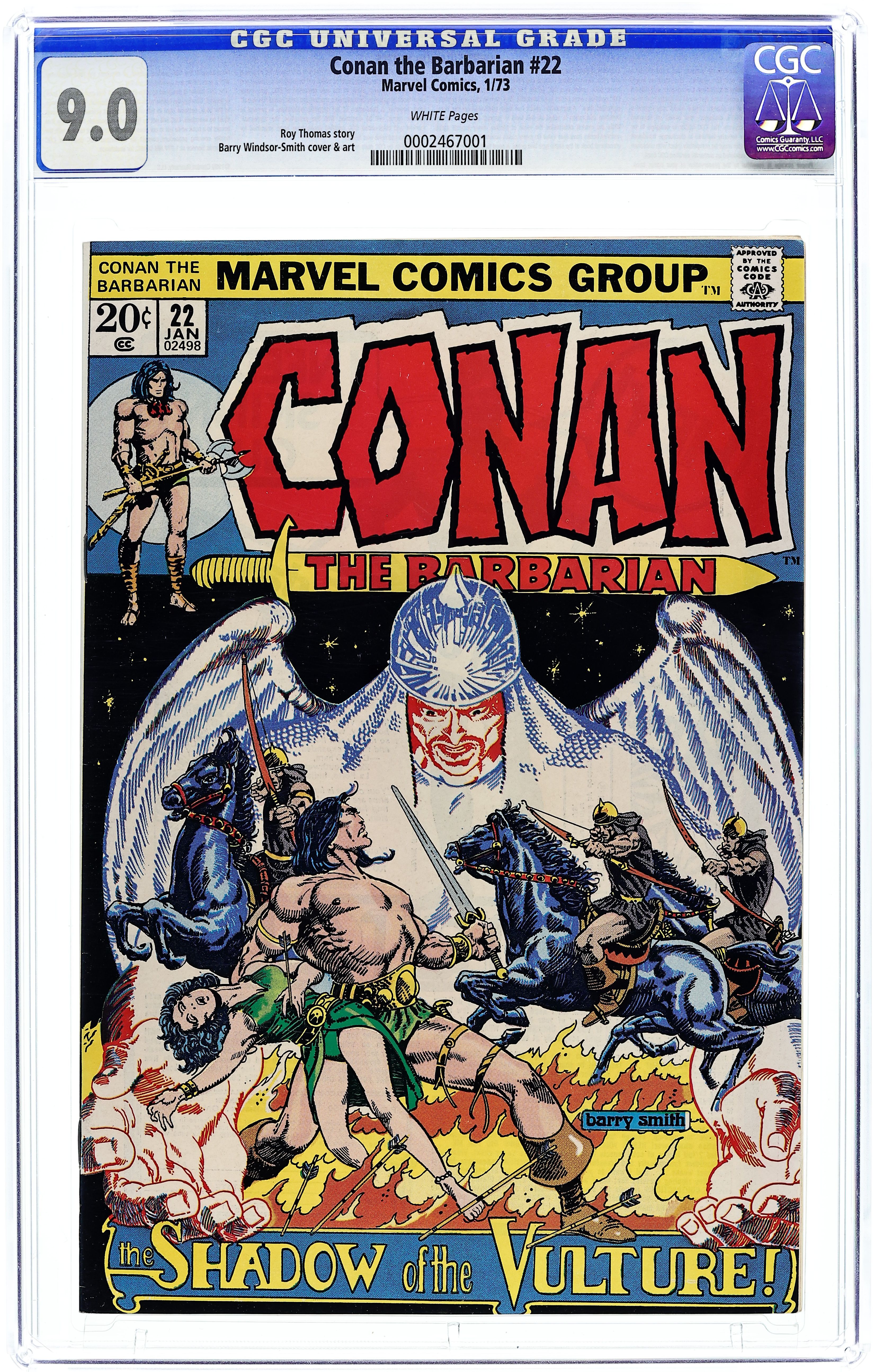 Cover art by Gil Kane. First appearance of Red Sonja in The Shadow of the Vulture, script by Roy Thomas, pencils by Barry Windsor-Wmith, inks by Sal Buscema, Dan Adkins, and Chic Stone; setting: Pah-Dishah, Makkalet; Conan delivers message from Makkalet to Pah-Disha; Red Sonja saves Conan's life twice; Conan kills Mikhal Oglu (vulture) and sends his head to Yezdigerd; adapted from the non-Conan story by Robert E. Howard featuring a female warrior, Red Sonya. 36 pgs. Cover price $0.20. Cover price $0.20.