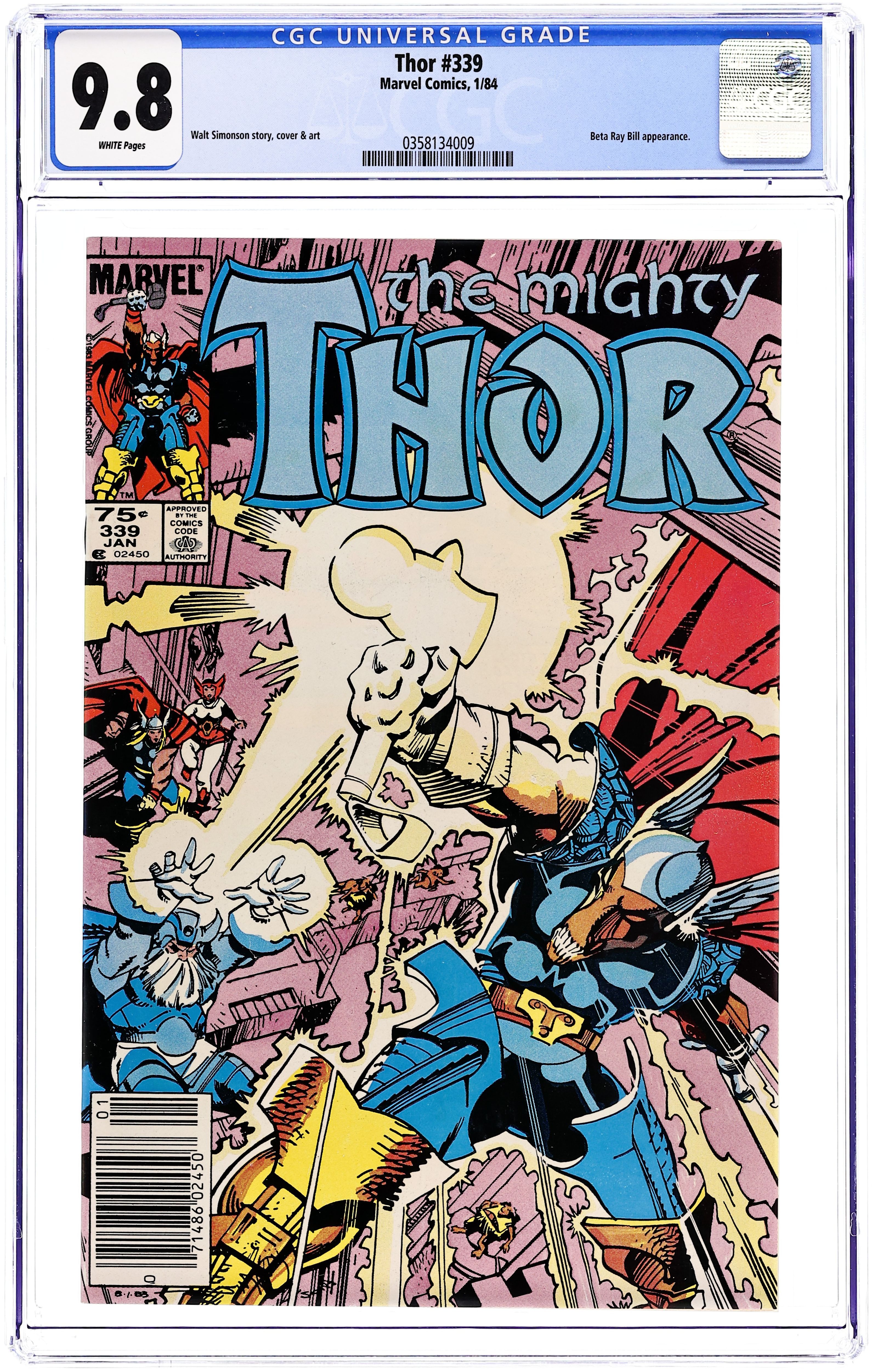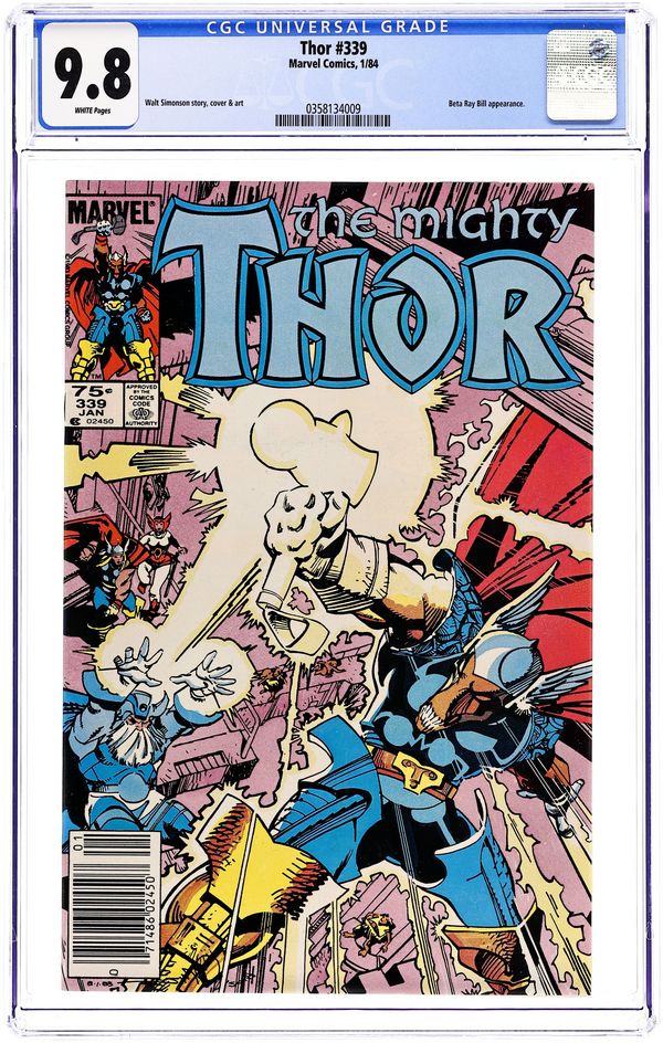 Ends Jan 15 9:40 PM CST Bid History 5 bids Current Bid $46 Your Secret Max Bid If you'd like to bid, please log in or register. Canadian edition with $.75 cover price. Cover by Walt Simonson. Beta Ray Bill (first appearance) becomes Thor in "Doom!", script and art by Walt Simonson; Nick Fury asks Thor's aid in investigating an alien ship heading for earth; Thor arrives and triggers the awakening of an alien protector, Beta Ray Bill; Bill bests Thor and takes up his hammer only to be accidentally summoned to Asgard by Odin who thinks he is summoning Thor. Brief appearances by Nick Fury, Loki, Sif, Balder, Heimdall, Volstagg, and Odin. First appearance of Lorelei (sister of the Enchantress). Begins Walt Simonson's run on Thor (through #382). Bullpen Bulletins. Star Frontiers TSR ad. 36 pgs., full color. Cover price $0.75.