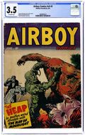 Cover by Arthur Peddy and Bernard Sachs. Stories and art by Arthur Peddy, Bernard Sachs, C. W. Winter, Carmine Infantino, Joe Simon and Jack Kirby. One of the more fanciful and influential of 1940s aviator heroes, Airboy fights evil with his radio-controlled plane "Birdie" and its plethora of experimental flying tech. Sometimes listed as Airboy Comics #43. No issue # on cover; Vol. 4, issue #8 in indicia. Airboy gives chase when action-girl Bonnie Easter returns and is promptly kidnapped. A small-time hood who owes money to the mob decides to capture The Heap for the reward. Flying Fool battles Mordecai Grumm, who believes flying planes are unnatural and blasphemous, in a story with art by Captain America creators Jack Kirby and Joe Simon. Propeller bondage elements on the cover (or as one bad guy puts it, "givin' da girl friend a whirl.") Airboy; The Heap; Model Builders With Airboy; Buckbite Brothers; Rackman; Flying Fool: His Brother's Keeper; Inside Man. 52 pages, Full Color. Cover price $0.10.