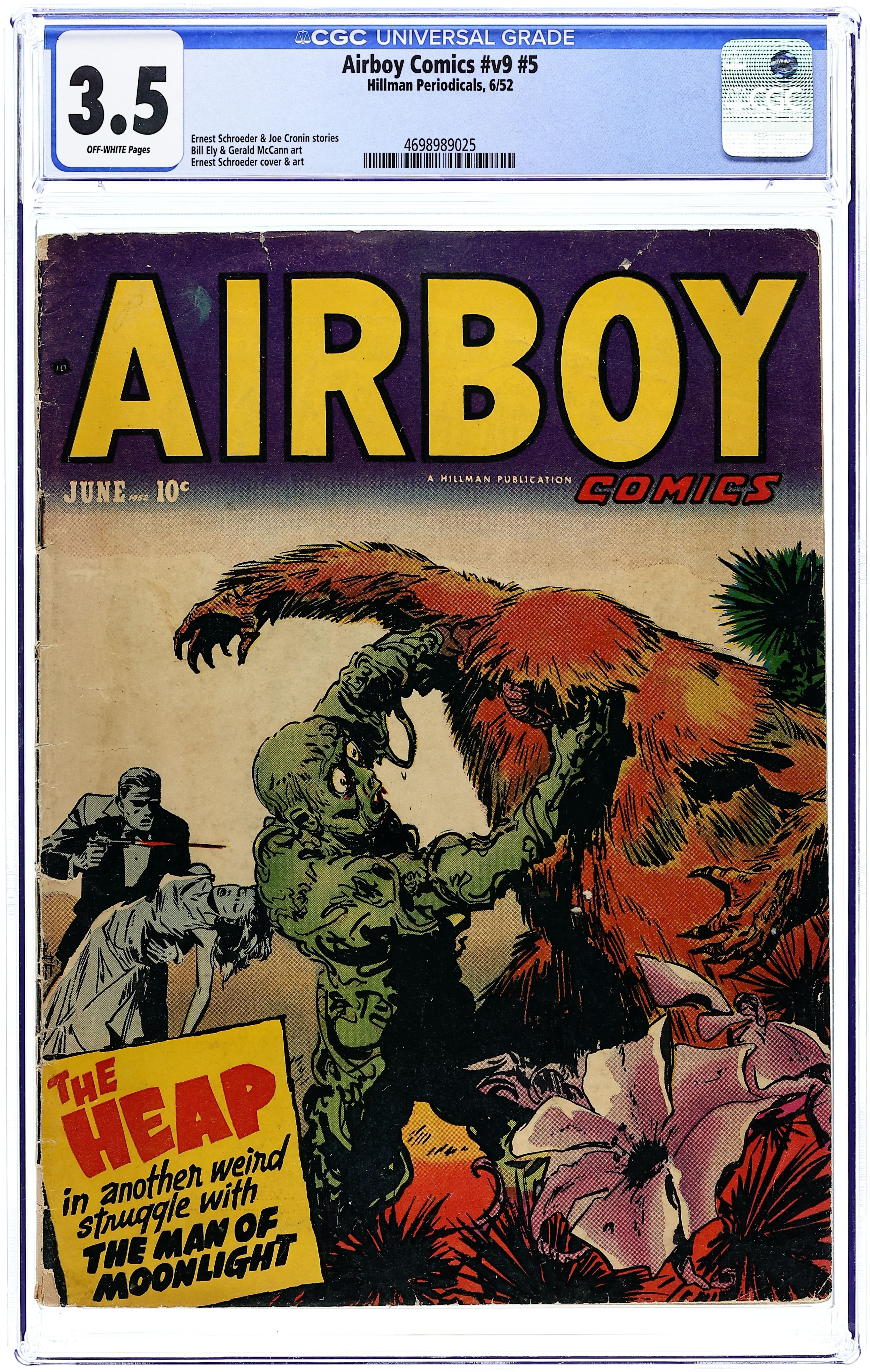 Cover by Ernest Schroeder. Stories and art by Dick Briefer, Charles Raab and Ernest Schroeder. One of the more fanciful and influential of 1940s aviator heroes, Airboy fights evil with his radio-controlled plane "Birdie" and its plethora of experimental flying tech. Sometimes listed as Airboy Comics #86. No issue # on cover; Vol. 8, issue #3 in indicia. Airboy battles Doctor Cyclon and the radioactive man called "The Living Fuse" aboard an experimental sea vessel. The Heap and a military deserter on the run encounter Count de Flon, aka the Mad Hermit, at the Dark Chateau. An aging lawman becomes sheriff of a 1930s Western town, in a story with art by Dick Briefer. Airboy Meets the Living Fuse!; The Heap; Lady of the Forest, Part 2; The Man Without Notches; Terrible Terry; Off the Orkney Islands; Great Moments In Football. 48 pages, Full Color. Cover price $0.10.