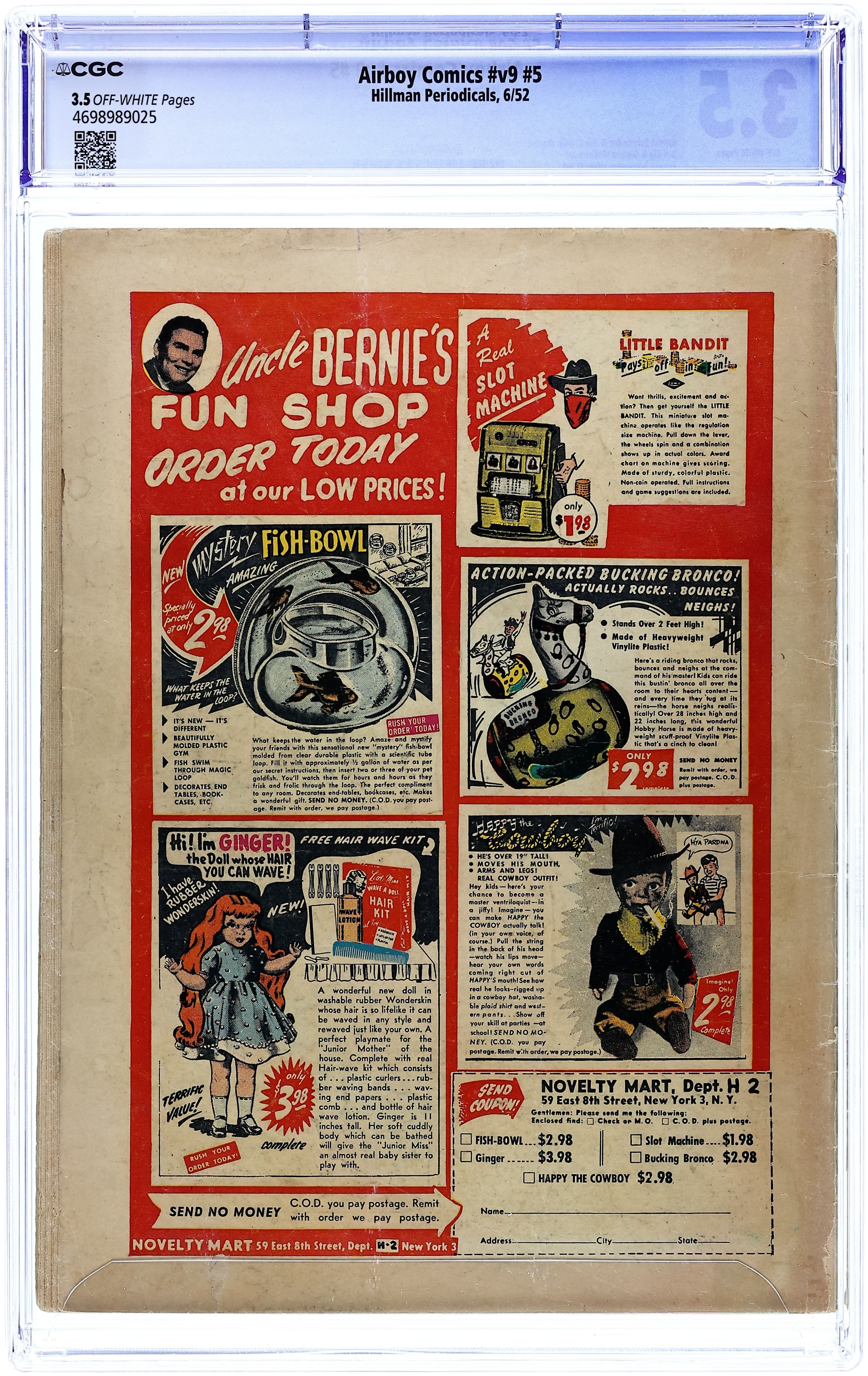 Cover by Dan Barry. Stories and art by Arthur Peddy, Bernard Sachs, Frank Giacoia and Fred Kida. One of the more fanciful and influential of 1940s aviator heroes, Airboy fights evil with his radio-controlled plane "Birdie" and its plethora of experimental flying tech. Sometimes listed as Airboy Comics #49. No issue # on cover; Vol. 5, issue #2 in indicia. Airboy hears a raving man's tale of The Wild Horse of Calabra. A Central American prospector tries to kill his partner to claim their find for himself, but he hadn't reckoned on The Heap, or human greed. Flying Fool and his female rival Riot O'Hara race to claim a dangerous job in the wilds of northern China. Eye-catching cover by Flash Gordon's Dan Barry. Airboy: The Wild Horse of Calabra; The Heap; Model Builders with Airboy; Right On Time; Horsethief; Flying Fool; The Golden Altar of Panama. 52 pages, Full Color. Cover price $0.10.