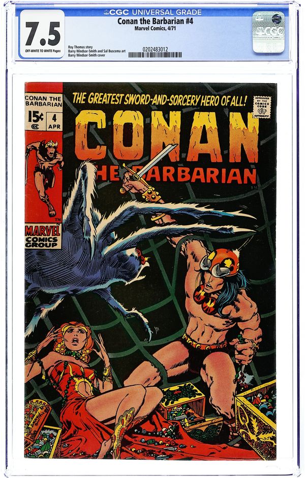 Cover art by Barry Windsor-Smith. Web of the Spider-God, plot by John Jakes, script by Roy Thomas, pencils by Barry Windsor-Smith, inks by Sal Buscema; setting: desert east of Ophir & city of Yezud; Conan is delirous in desert, Thanix saves his life; Conan fights Omm (giant spider), Tork destroys Yezud and leaves for Shadizar with Lea. 36 pgs. Cover price: $0.20. Cover price $0.20.