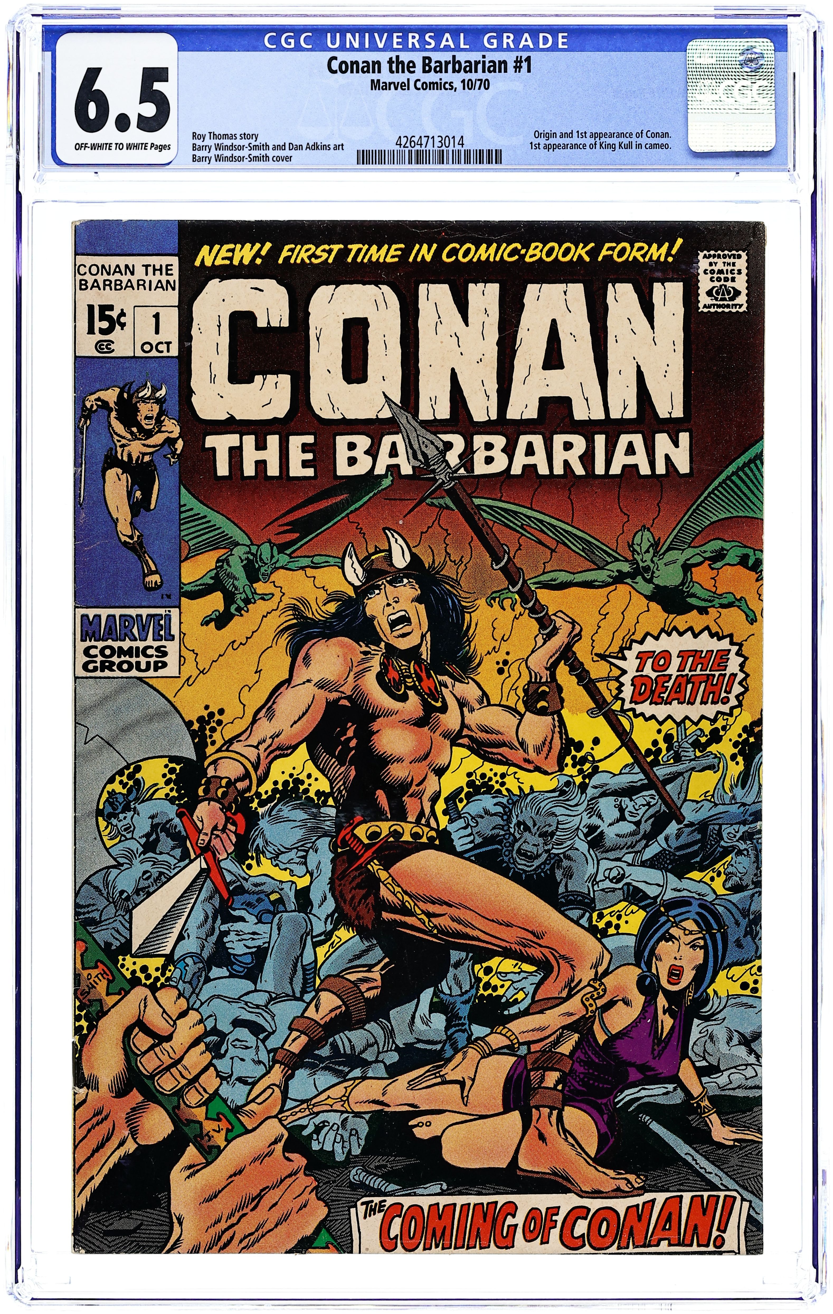 Cover art by Barry Windsor-Smith. The Lurker Within!, script by Roy Thomas, pencils by Barry Windsor-Smith, inks by Sal Buscema; setting: Nemedian city of Numalia; Lady Aztrias betrays Conan. Conan burgles a merchant's building, is accused of murder, fights & kills a serpent-man, saves Demetrios's life and sees Thoth-Amon; adapted from the story The God in the Bowl by Robert E. Howard. 36 pgs. Cover price: $0.15. Cover price $0.15.