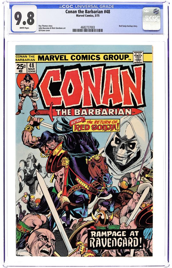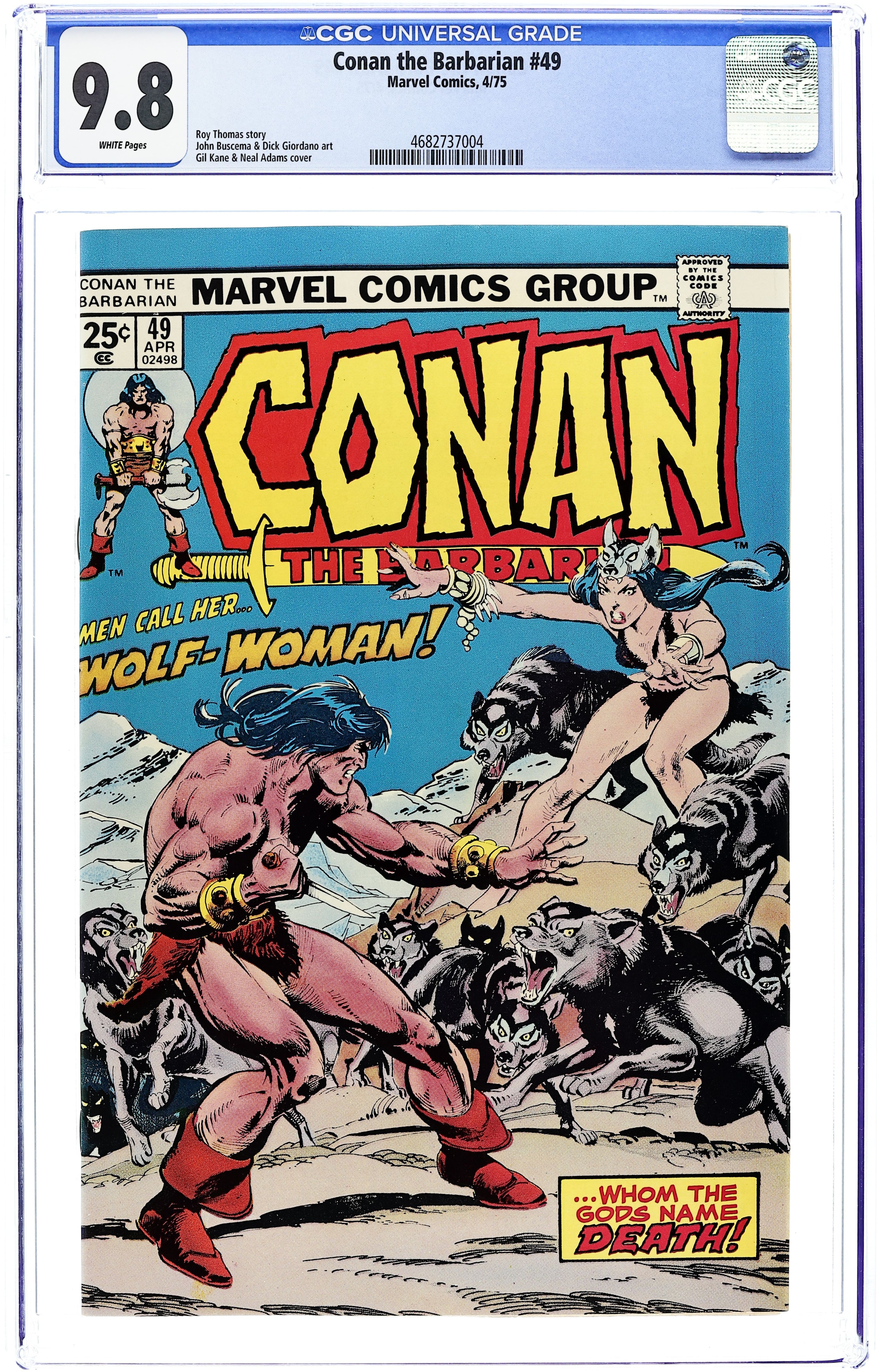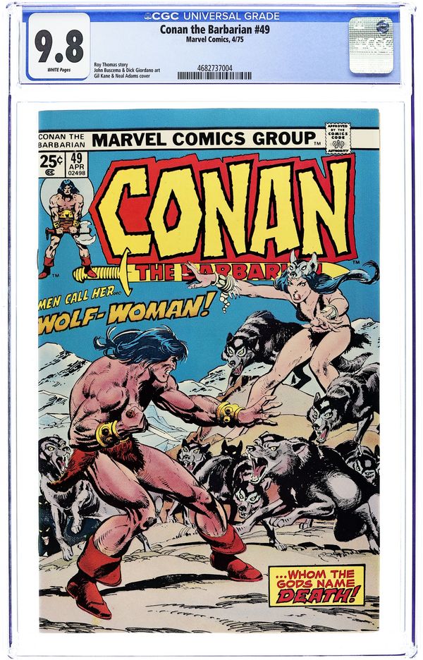 Cover pencils by Gil Kane, inks by Neal Adams. Wolf-Woman, script by Roy Thomas, pencils by John Buscema, inks by Dick Giordano; setting: Western border wastelands & Castle Ravengard; Conan & Lupalina Invade Castle Ravengard & rescue Stefanya; Conan wounds Torkal Moh (unknown if he dies); adapted from the novel "Kothar and the Conjurer's Curse" by Gardner F. Fox. Letters to the editor from Dean Mullaney (Eclipse Comics) and writer Frank Lovece. The letters page also contains Marvel Value Stamp Series A # 80 (the Ghost Rider). 36 pgs. Cover price $0.25. Cover price $0.25.
