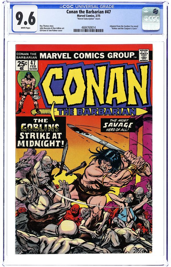 Cover pencils by Gil Kane, inks by Tom Palmer. Goblins in the Moonlight, script by Roy Thomas, pencils by John Buscema, inks by Dan Adkins; setting: Western border wastelands; Conan saves Zoqqanor by fighting hobgoblins; adapted from the novel "Kothar and the Conjurer's Curse" by Gardner F. Fox. Reprint back-up story, Sanctuary, script and art by Wally Wood. Also in this issue: an essay on Conan's origin by Fred Blosser, and a pin-up of young Conan by Tim Conrad. Originally included a tear out order form which may or may not be present. 36 pgs. Cover price $0.25.
