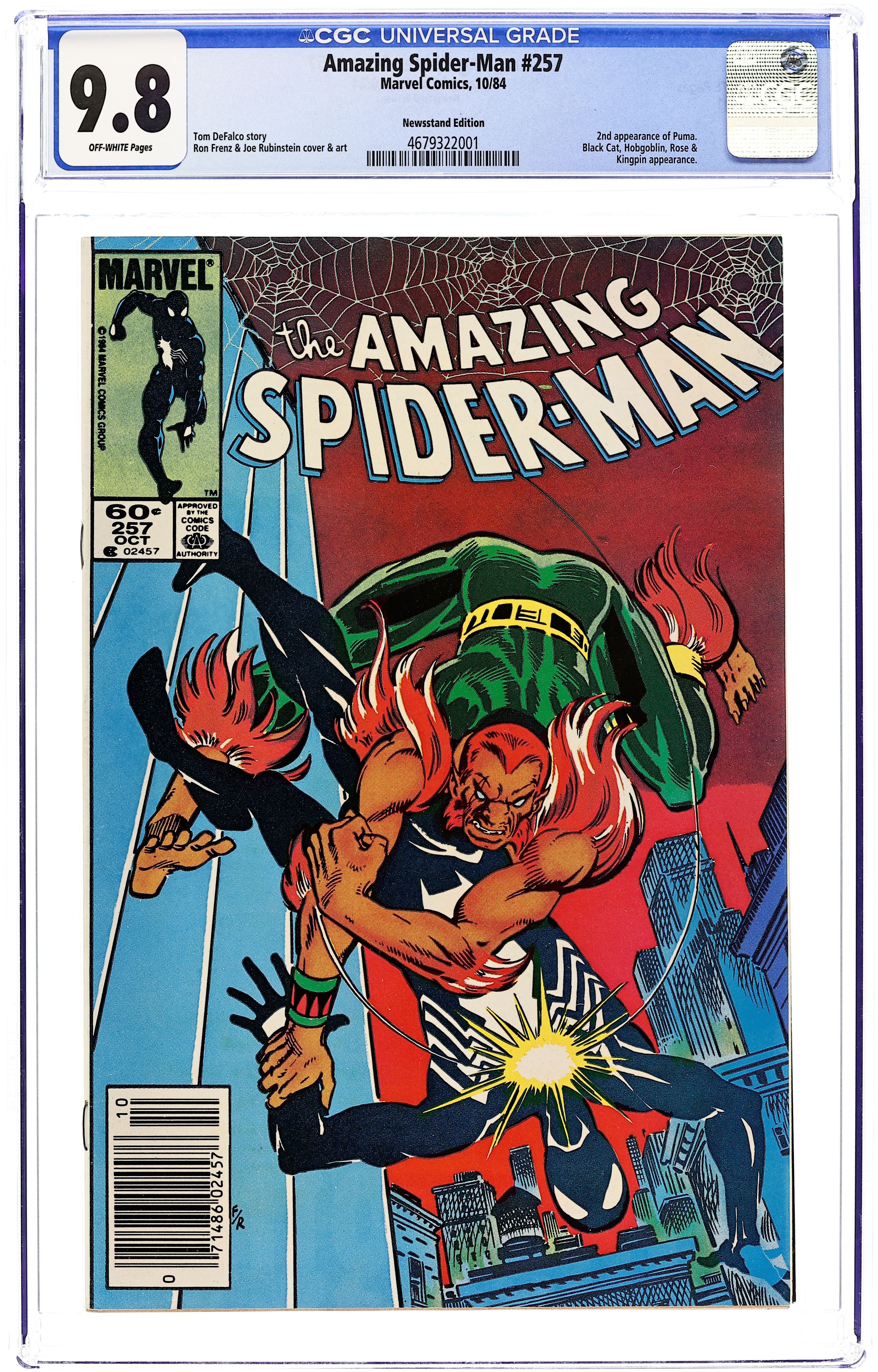 Direct Edition. "The Sinister Secret of Spider-Man's New Costume!" Guest-starring Mr. Fantastic and the Human Torch. Script by Tom DeFalco. Pencils by Ron Frenz. Inks by Joe Rubinstein. Cover by Ron Frenz and Joe Rubinstein. Chaos erupts at 410 Chelsea when Mary Jane Watson and the Black Cat meet inside Peter Parker's apartment! Wow, what a shocking development! To say that the web-slinger has some explaining to do...would be the understatement of the year! After the dust settles, the wall-crawler swings over to the Baxter Building to let Reed Richards analyze his new black costume. When Spider-Man learns his costume is "alive," he tries to pull it off; but the alien symbiote has other ideas! Can the Fantastic Four help Spidey with his major wardrobe malfunction? Cameo appearances by the Rose, Hobgoblin, and Puma. (Notes: The Black Cat and Mary Jane Watson are formally introduced to one another in Spectacular Spider-Man 123. The cover does not display the typical UPC box in the lower left-hand corner. This issue was reprinted in Marvel Tales 272.) 36 pages. Cover price $0.60.