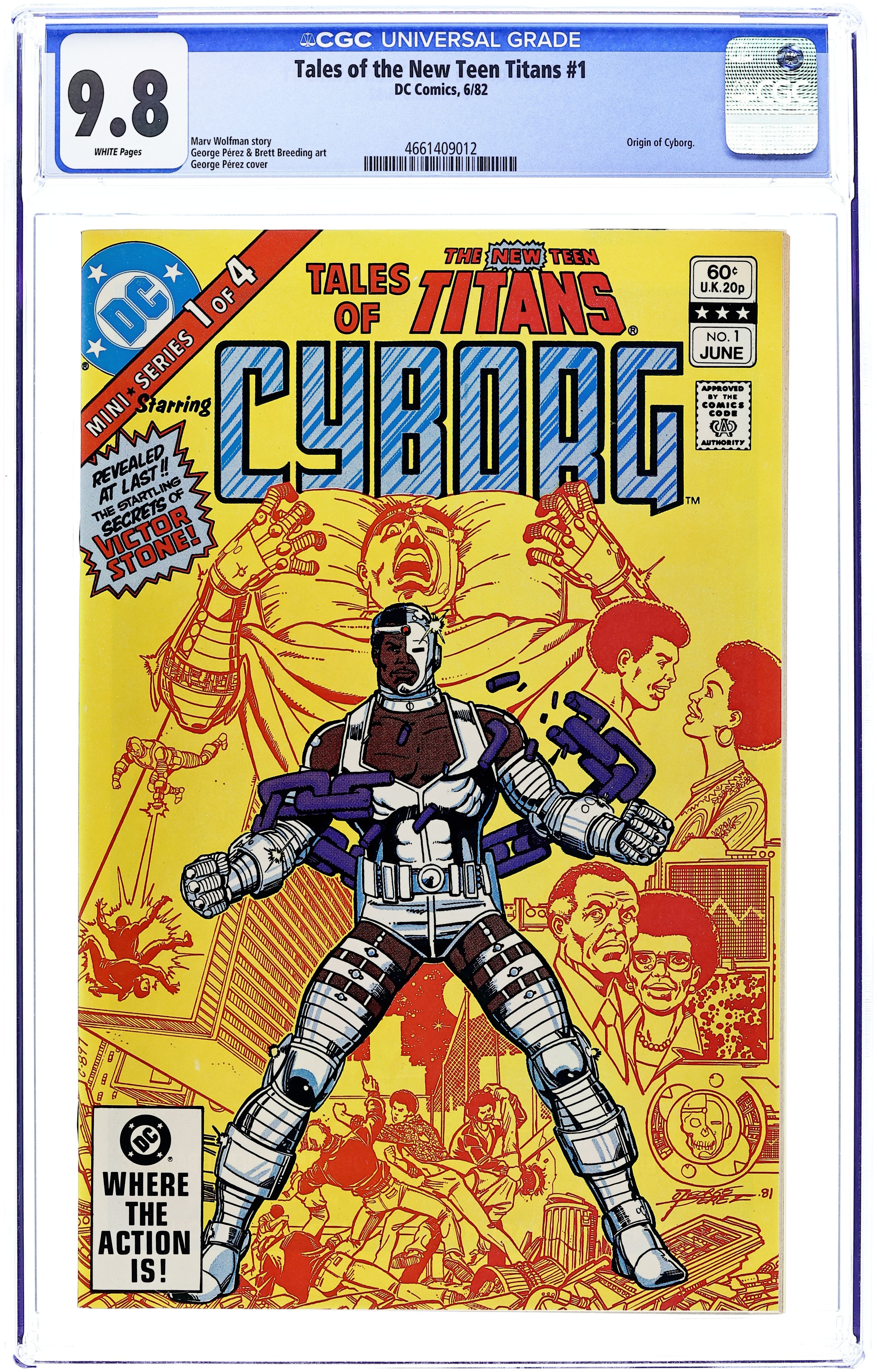 Newsstand Edition. Script by Marv Wolfman, pencils by George Perez, embellishes by Brett Breeding. Cyborg pin-up by Perez. Cover by Perez. Victor Stone tells the other Titans about his past, relating his animosity towards his father, running with the wrong crowd, and the events that turned him into "Cyborg." 25-page tale. Appearances by Robin, Wonder Girl, Kid Flash, Starfire, Changeling, Raven. Cover price $0.60.