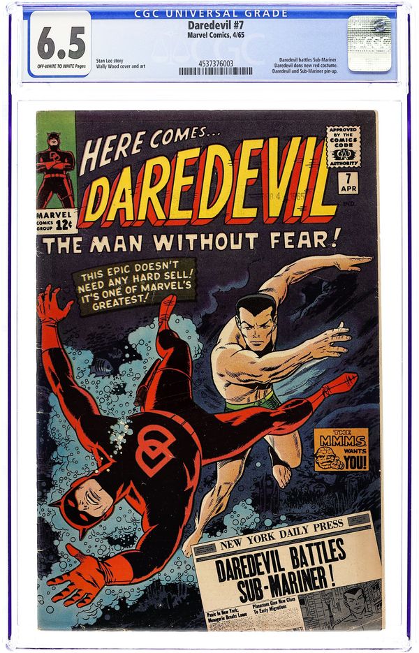 "In Mortal Combat with Sub-Mariner!" Written by Stan Lee. Art and cover by Wally Wood. Namor hires Franklin and Murdock to sue the human race on his behalf. When this doesn't work, he gets himself arrested so he can have his day in court. Realizing humanity won't listen, the Sub-Mariner goes on a rampage which brings Daredevil into the (hopeless) fray. Namor returns to the sea out of respect for DD and to stop Krang from taking over Atlantis. Sub-Mariner/Daredevil pin-up by Wood. Note: First appearance of Daredevil's red costume. 36 pages, full color. Cover price $0.12.