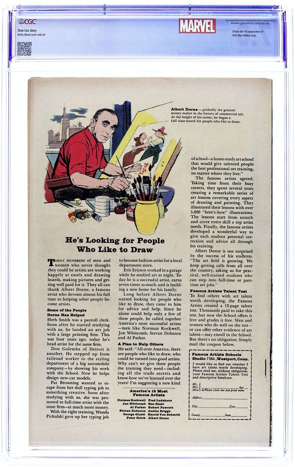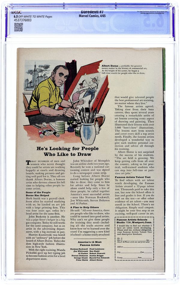 Cover pencils by Jack Kirby, inks by Bill Everett. First appearances of Daredevil, Karen Page, and Foggy Nelson in The Origin of Daredevil, script by Stan Lee, art by Bill Everett (splash page penciled by Jack Kirby); Matt Murdock saves a blind man from an oncoming truck but is struck blind himself by a radioactive canister during the rescue; The radioactivity heightens Matt's other senses and gives him an uncanny radar sense; Matt graduates college and begins practicing law with his college roommate Foggy; Matt's father, a boxer, is killed by the Fixer after he refuses to throw a fight; Matt designs a costume and a billy club (from his cane) and takes his derogatory childhood nickname "Daredevil"; DD tracks down the Fixer and the man who shot his father. Spider-Man and Fantastic Four appear on the cover but not in the story inside. 36 pgs. Cover price $0.12. Cover price $0.12.