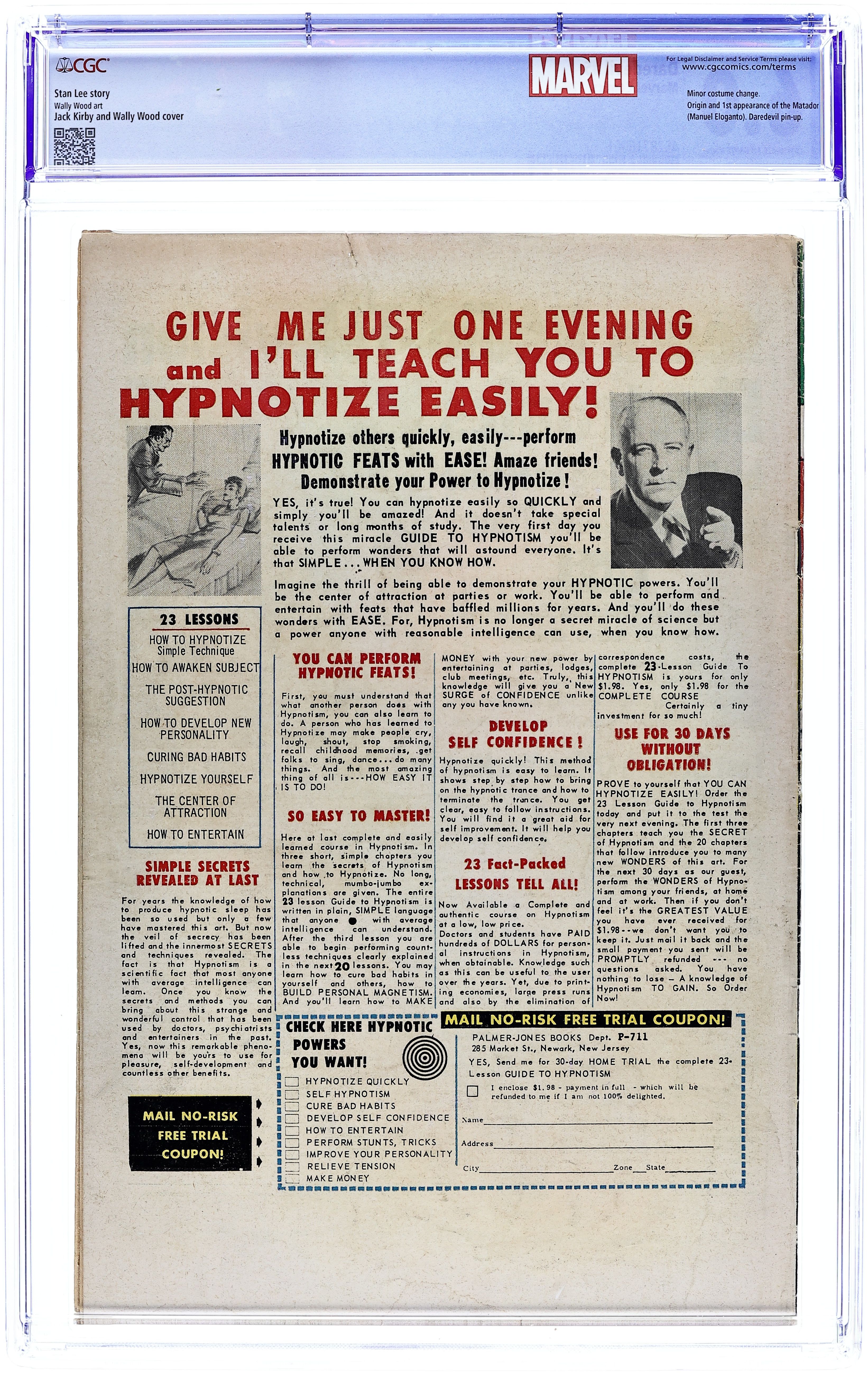 Cover art by Wally Wood. First appearance of Klaus Kruger in That He May See!, script by Stan Lee, pencils by Bob Powell, breakdowns and finished art by Wally Wood; One of Matt's old college pals is a ruler of his own European country and invites the blind lawyer over to see a doctor about restoring his sight; Once in Lichtenbad, DD is needed as Kruger turns out to be a ruthless dictator; The only doctor who could restore Matt's vision dies in the revolt. 32 pgs. Cover price $0.12. Cover price $0.12.