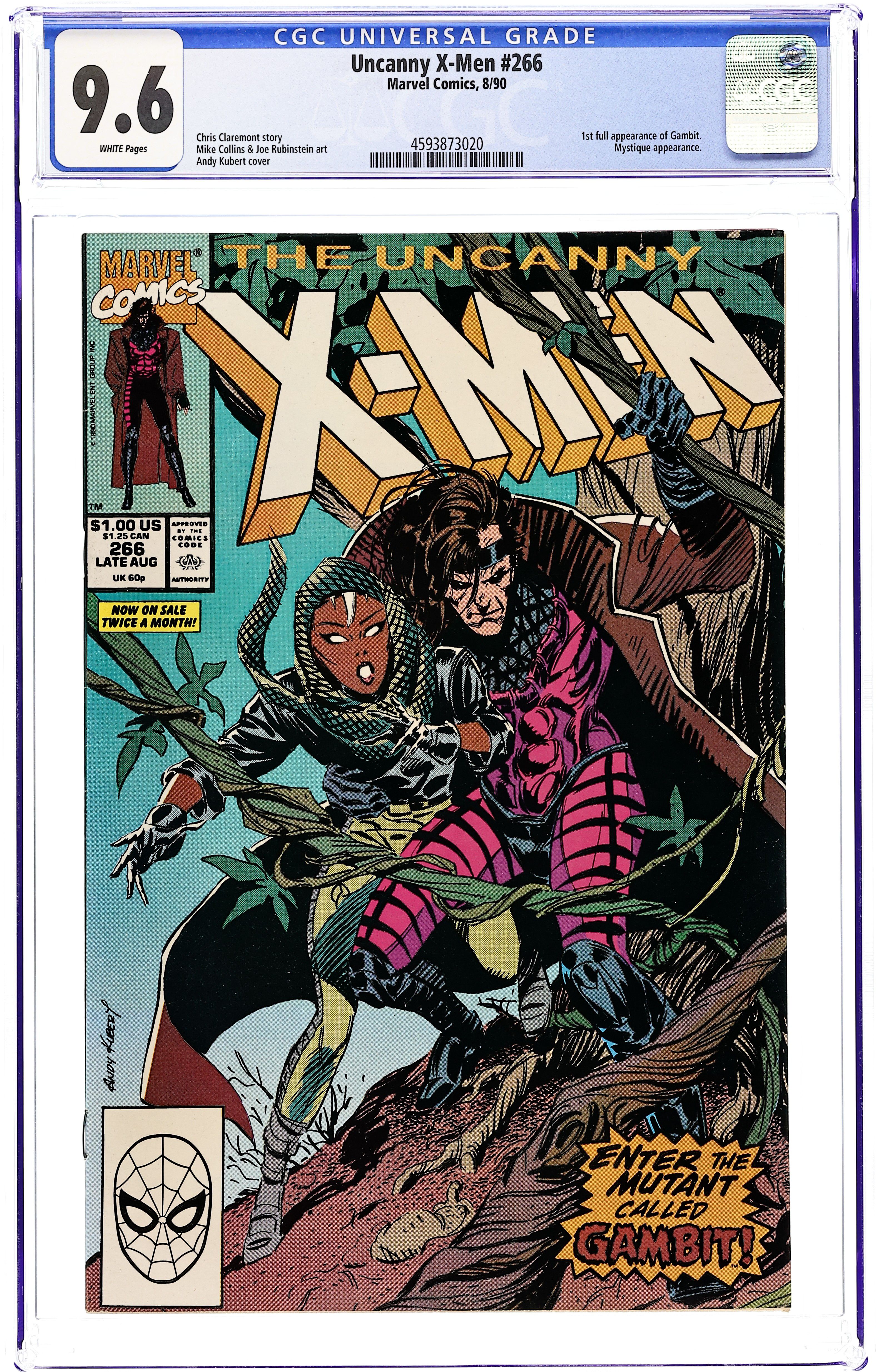 Direct Edition. "Gambit!" Part 2 of 3. Story by Chris Claremont. Art by Mike Collins and Joe Rubinstein. Cover by Andy Kubert. The Hounds are closing in on the young thief named Storm. Her only hope may lie in the hands of a mysterious and charming stranger. Plus, the Shadow King wants Mystique dead. NOTE: 1st appearance of Gambit. 36 pages, full color. Cover price $1.00.