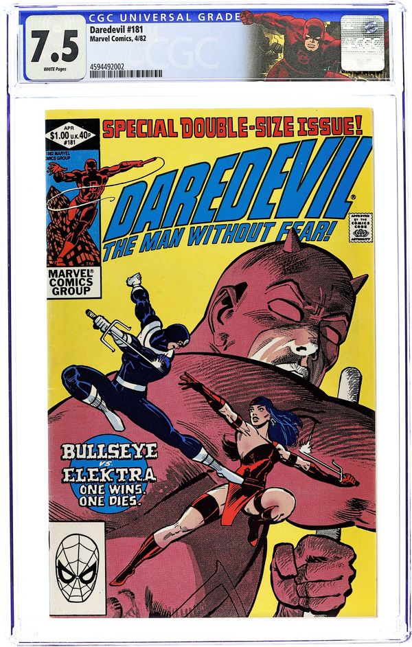 Direct Edition. Giant-size issue. Cover pencils by Frank Miller, inks by Klaus Janson. Resurrection, script by Frank Miller, pencils by Frank Miller (layouts) and Klaus Janson (finished art), inks by Klaus Janson; DD, the Black Widow and Stone race to keep the Hand from resurrecting Elektra; Unbeknownst to Daredevil, Stone finishes the job the Hand started and Elektra lives again; Appearances by the Kingpin and ninja assassins. Two Elektra pinups by Miller and Janson. Letter to the editor from comics writer Fabian Nicieza. Cover price $1.00. Cover price $1.00.