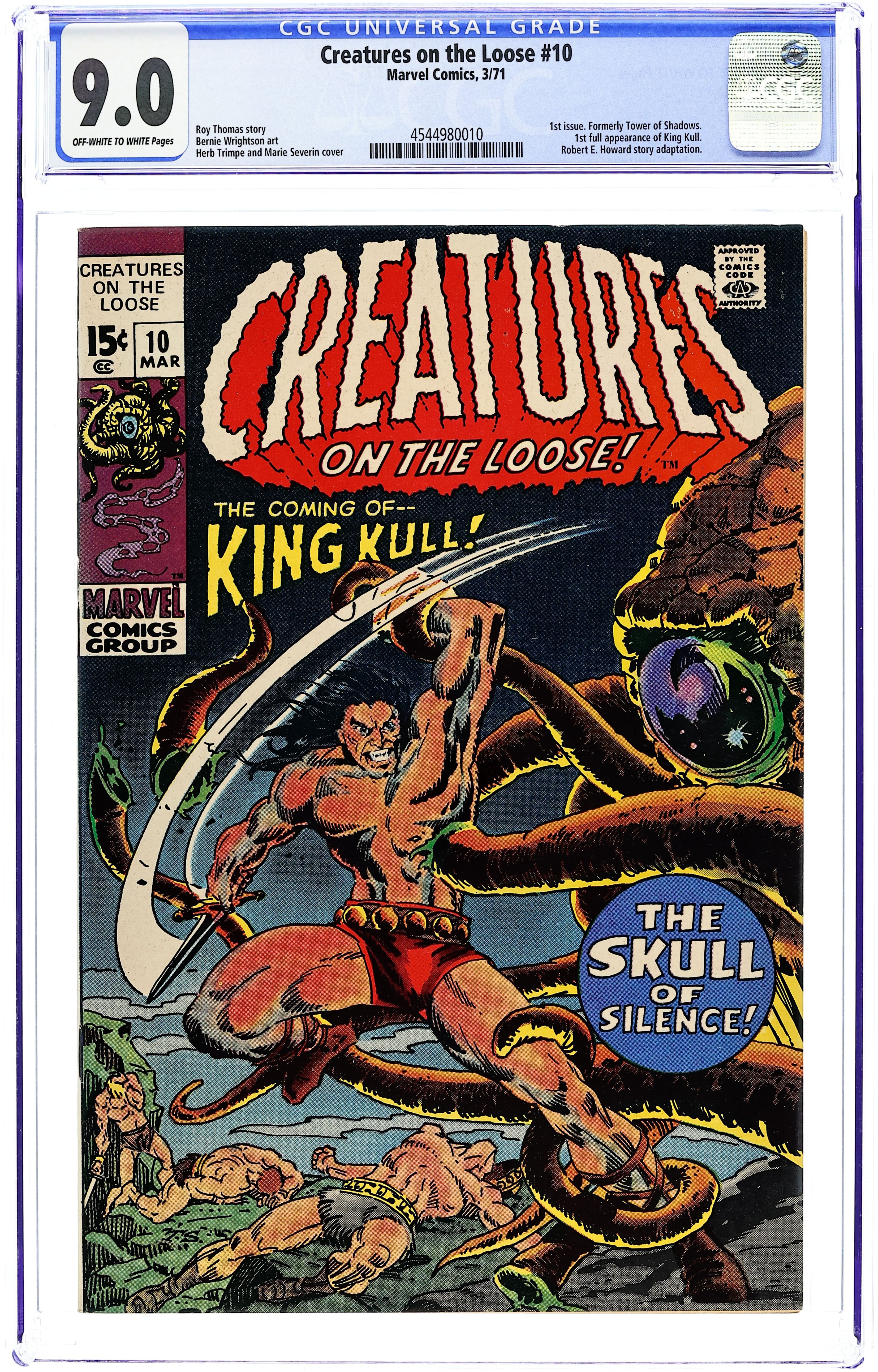 Starts Feb 9 Series formerly "Tower of Shadows." Written by Roy Thomas. Art by by Berni Wrightson (adapted from the Robert E. Howard story). Cover by Marie Severin. New story: first full comic book appearance of King Kull in "The Skull of Silence; Kull's arrogance leads to the release of an ancient menace that he barely is able to defeat. Art by Jack Kirby and Dick Ayers. Reprint"Trull the Unhuman!"; The mental essence of an alien bent on global conquest takes over a steam shovel and is defeated by an elephant. 36 pages, full color. $0.15. Cover price $0.15.