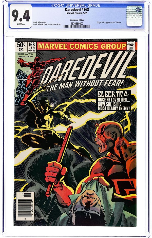 Newsstand Edition. Cover pencils by Frank Miller, inks by Klaus Janson. First appearance of Elektra in Elektra, script by Frank Miller, pencils by Frank Miller (breakdowns) and Klaus Janson (finished art), inks by Klaus Janson; Matt is after an international criminal being protected by Eric Slaughter when he runs across his college sweetheart turned bounty hunter; this story, by the way, is a reworking of a couple of classic Spirit stories by Will Eisner, Sand Serif and Bring in Sand Serif (1950). 36 pgs. Cover price $0.50. Cover price $0.50.