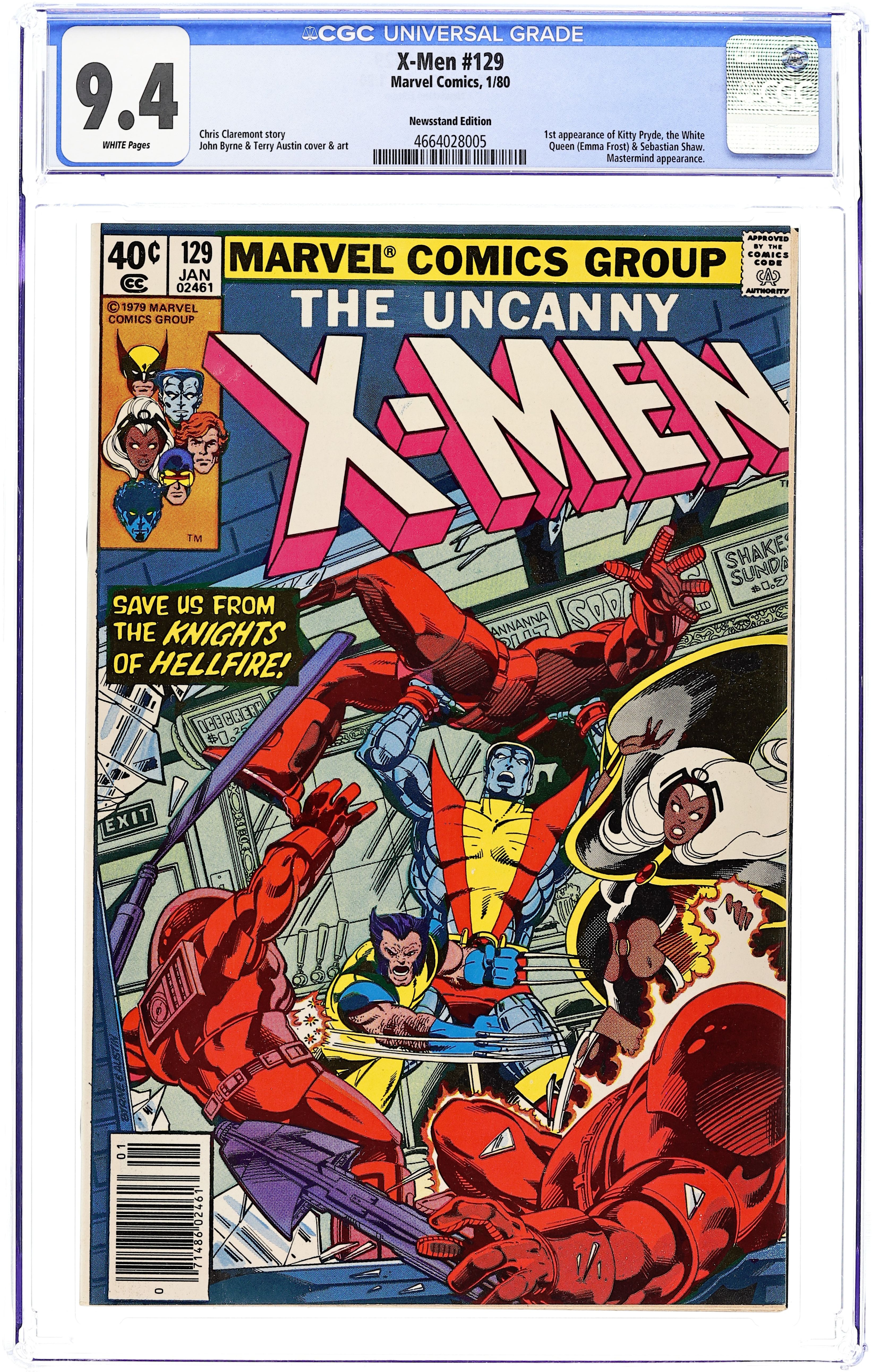 Newsstand Edition. The Dark Phoenix Saga: Part 1 of 9 - "God Spare the Children!" Story by Chris Claremont and John Byrne. Art by John Byrne and Terry Austin. This issue begins arguably the greatest and most tragic X-Men adventure of all time - The Dark Phoenix Saga. While the X-Men attempt to recruit a "New Mutant" by the name of Kitty Pryde, Wolverine, Colossus, and Storm are suddenly attacked by unknown assailants. What do these armored foes want, and who is the White Queen? 36 pages, full color. NOTE: 1st appearance of Kitty Pryde and Emma Frost, the White Queen. Cover price $0.40.