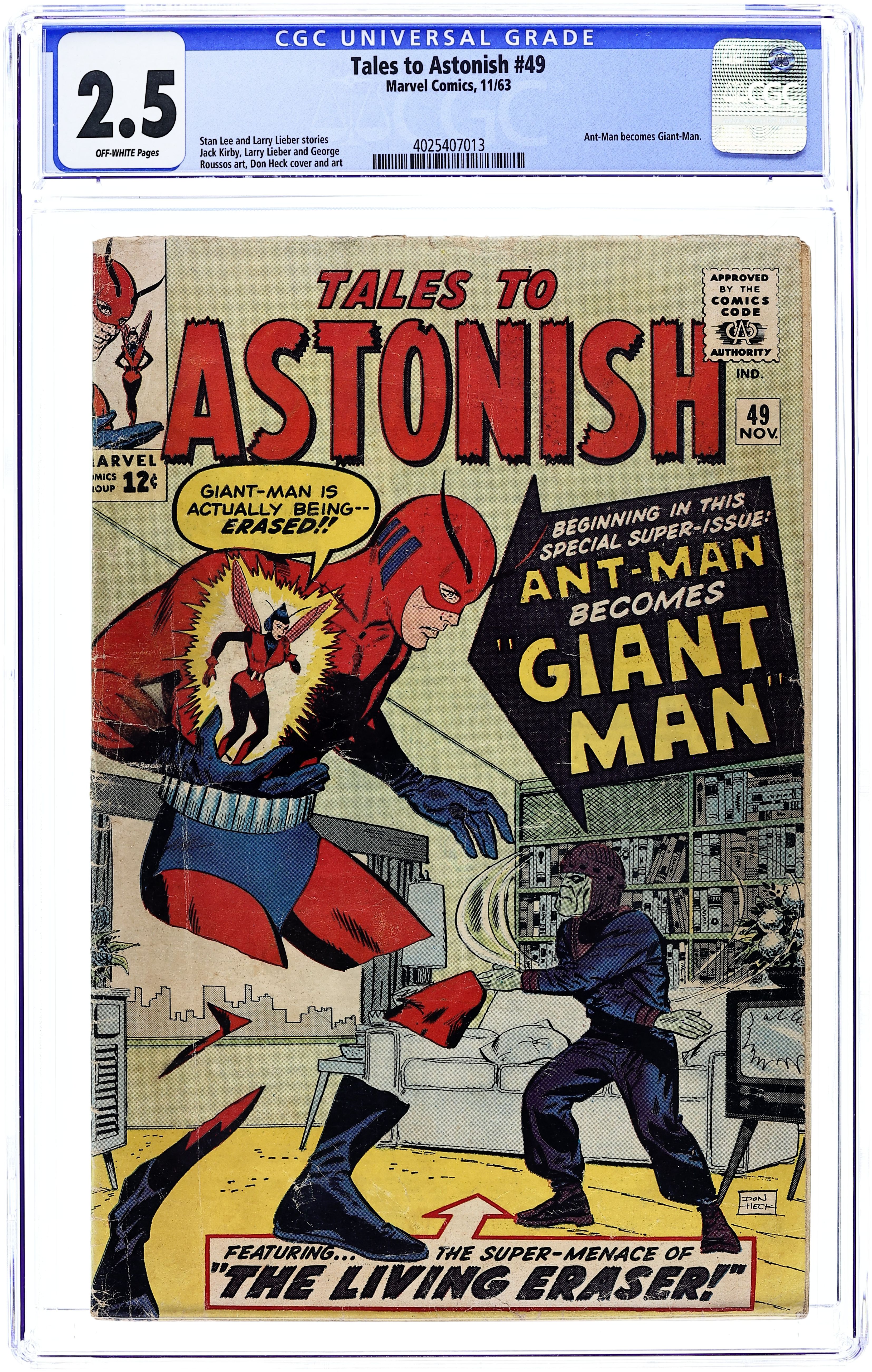 Cover by Don Heck. The Birth of Giant-Man!, script by Stan Lee, art by Jack Kirby and Don Heck; While Henry Pym develops capsules that permit him to become giant-size as well as ant-size, the Eraser captures him and brings him to Dimension Z along with other scientists to build atomic weapons. Odd Skills text story, art by Joe Maneely. The End of a World!, script by Stan Lee and Larry Lieber, art by Larry Lieber and George Roussos [as G. Bell]; A ruler orders the destruction of an uninhabited galaxy as a tribute to his power. 36 pgs., full color. $0.12. Cover price $0.12.