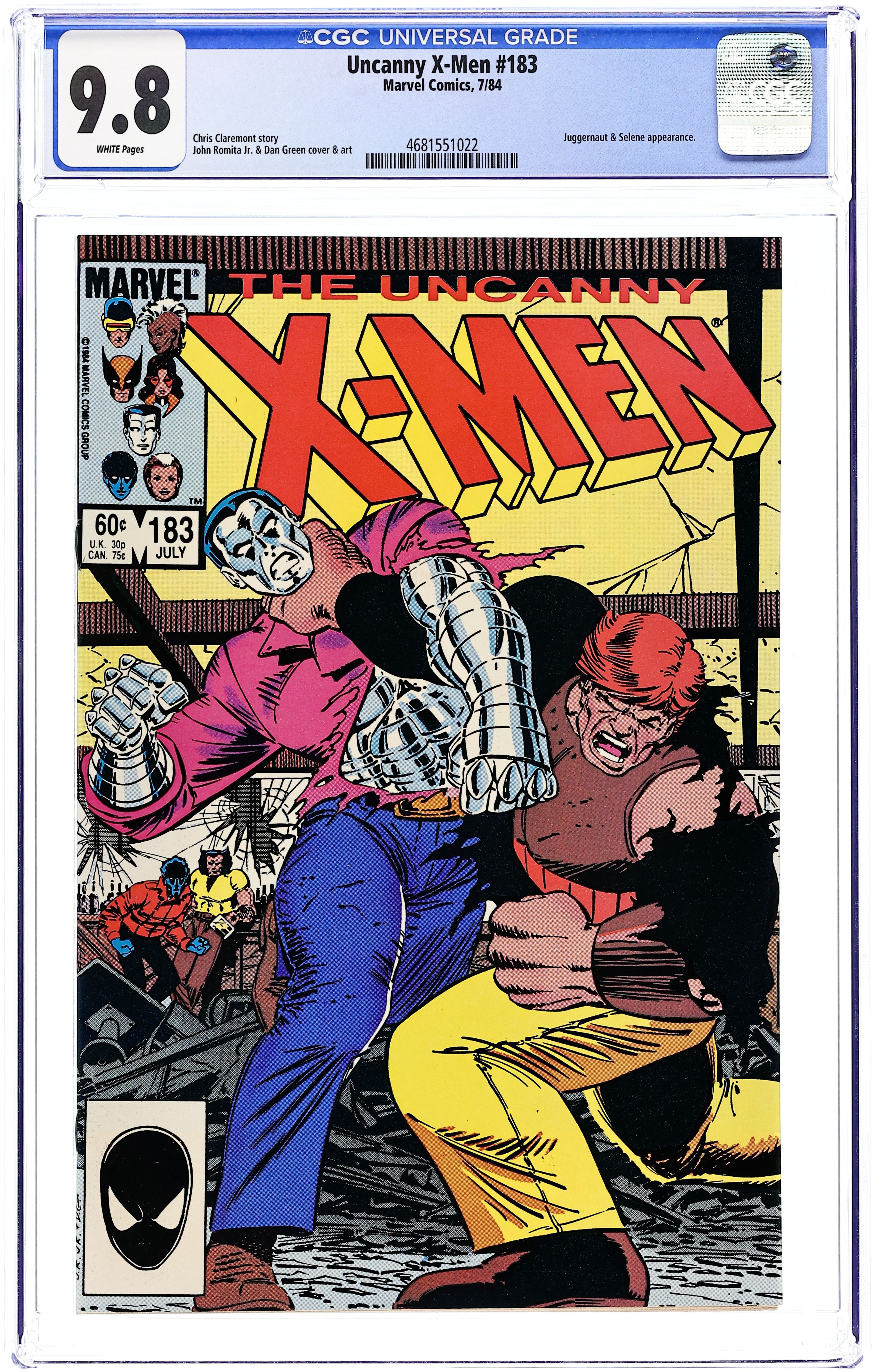 Direct Edition. "He'll Never Make Me Cry!" Story by Chris Claremont. Art by John Romita, Jr. and Dan Green. Peter reveals to Kitty his romantic affair with Zsaji, the beautiful alien healer he met on Battleworld (see Marvel Super Heroes Secret Wars [1984] #5), thus breaking the young girl's heart. Determined to set the boy straight, Wolverine and Nightcrawler take Peter out for a night on the town. Unfortunately, they end up at the same bar as the notorious Cain Marko. What follows is the most earthshaking battle between Colossus and the unstoppable Juggernaut ever seen. Plus, the introduction of a deadly new X-Men villain. 36 pgs. Cover price $0.60.