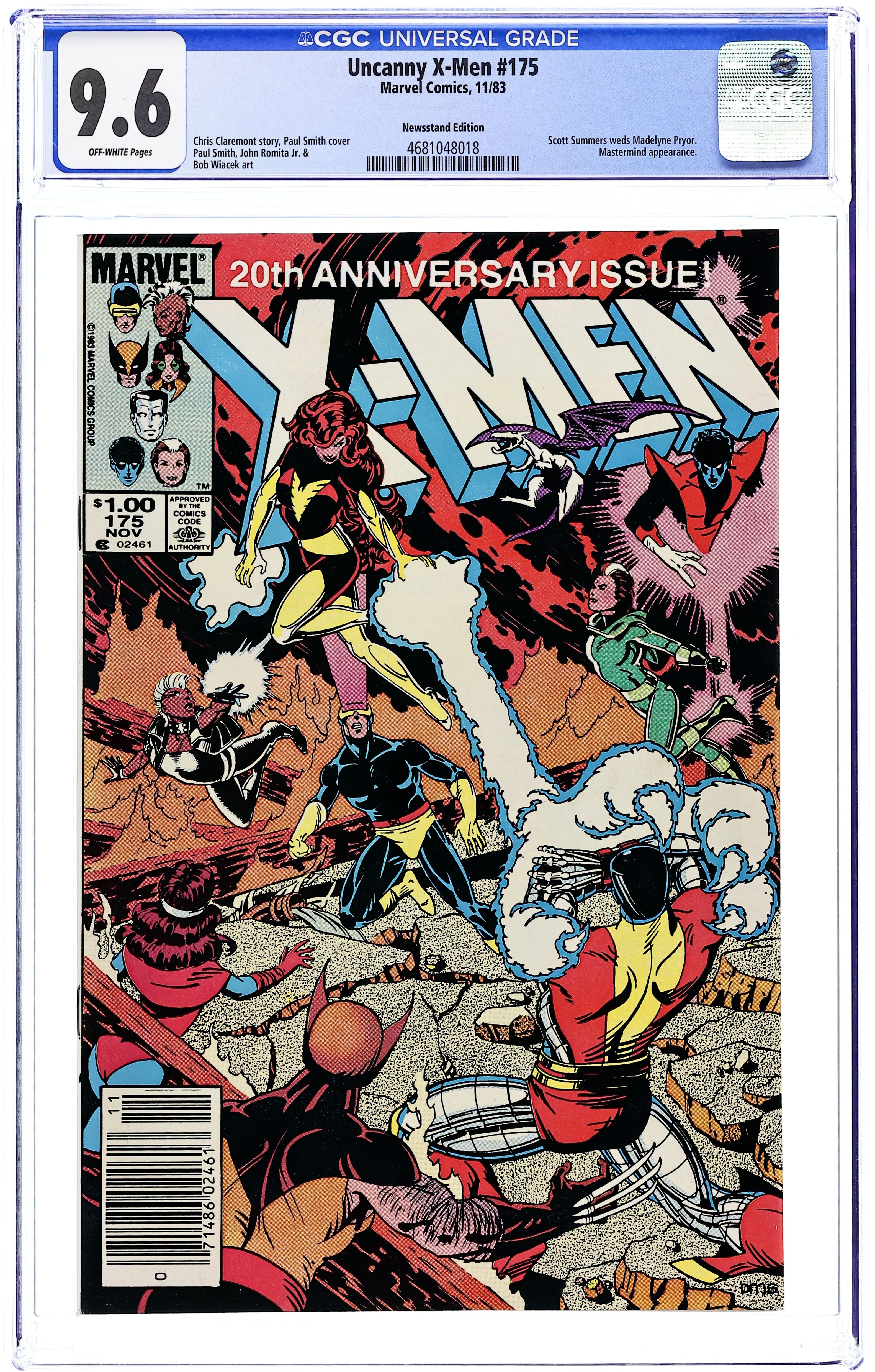 Newsstand Edition. 20th Anniversary Issue - Story by Chris Claremont. Art by Paul Smith, John Romita, Jr., and Bob Wiacek. Can it be true, have the X-Men's worst nightmares come true? Has the Dark Phoenix returned? Or is this all just another elaborate scheme to destroy the Children of the Atom? All this plus and X-Man gets married. 52 pgs. Cover price $1.00.