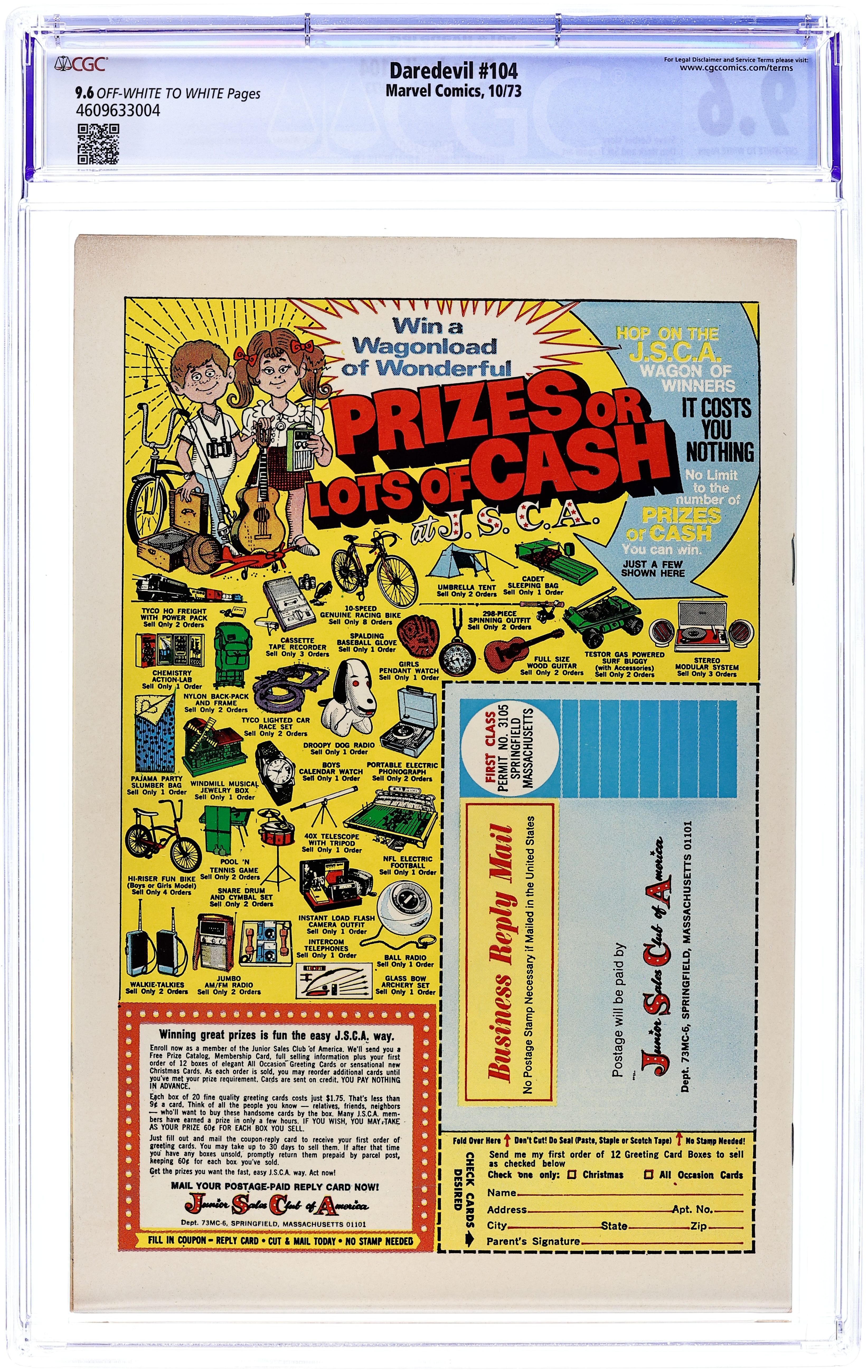 Giant-size issue. Cover pencils by Gil Kane, inks by Frank Giacoia. And Death Is a Woman Called Widow, script by Gerry Conway, pencils by Gene Colan, inks by Jack Abel; Black Widow saves DD from drowning and then the two of them take down the Owl; Mr. Kline is revealed to be the robot MK-9 who refers to himself by the code name "Assassin." Black Widow pin-up by Bill Everett. This issue also contains a Fantastic Four reprint from Strange Tales 132, The Sinister Space Trap!, script by Larry Ivie, pencils by Bob Powell, inks by Mickey Demeo. 36 pgs. Cover price $0.25. Cover price $0.25.