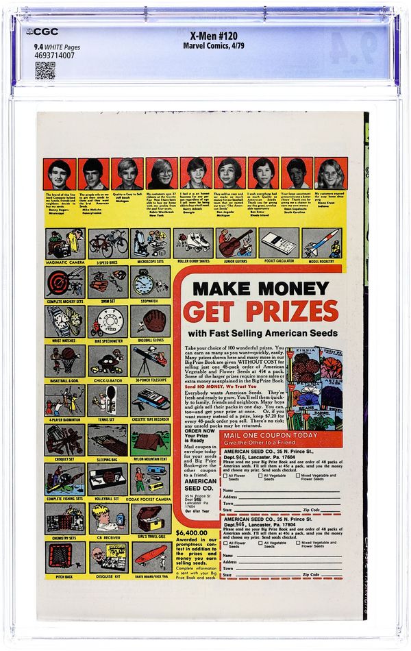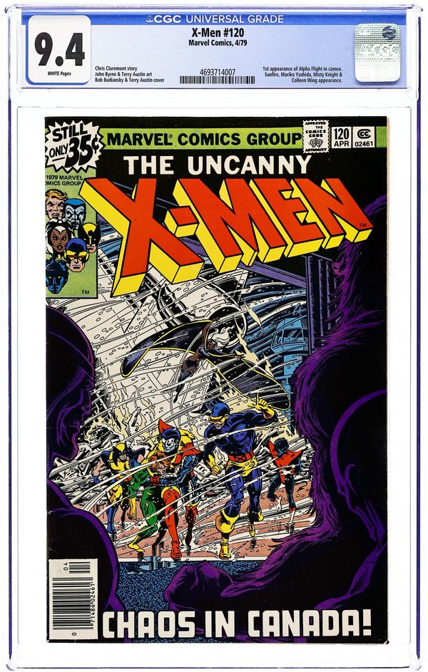 Newsstand Edition. The Dark Phoenix Saga: Part 1 of 9 - "God Spare the Children!" Story by Chris Claremont and John Byrne. Art by John Byrne and Terry Austin. This issue begins arguably the greatest and most tragic X-Men adventure of all time - The Dark Phoenix Saga. While the X-Men attempt to recruit a "New Mutant" by the name of Kitty Pryde, Wolverine, Colossus, and Storm are suddenly attacked by unknown assailants. What do these armored foes want, and who is the White Queen? 36 pages, full color. NOTE: 1st appearance of Kitty Pryde and Emma Frost, the White Queen. Cover price $0.40.