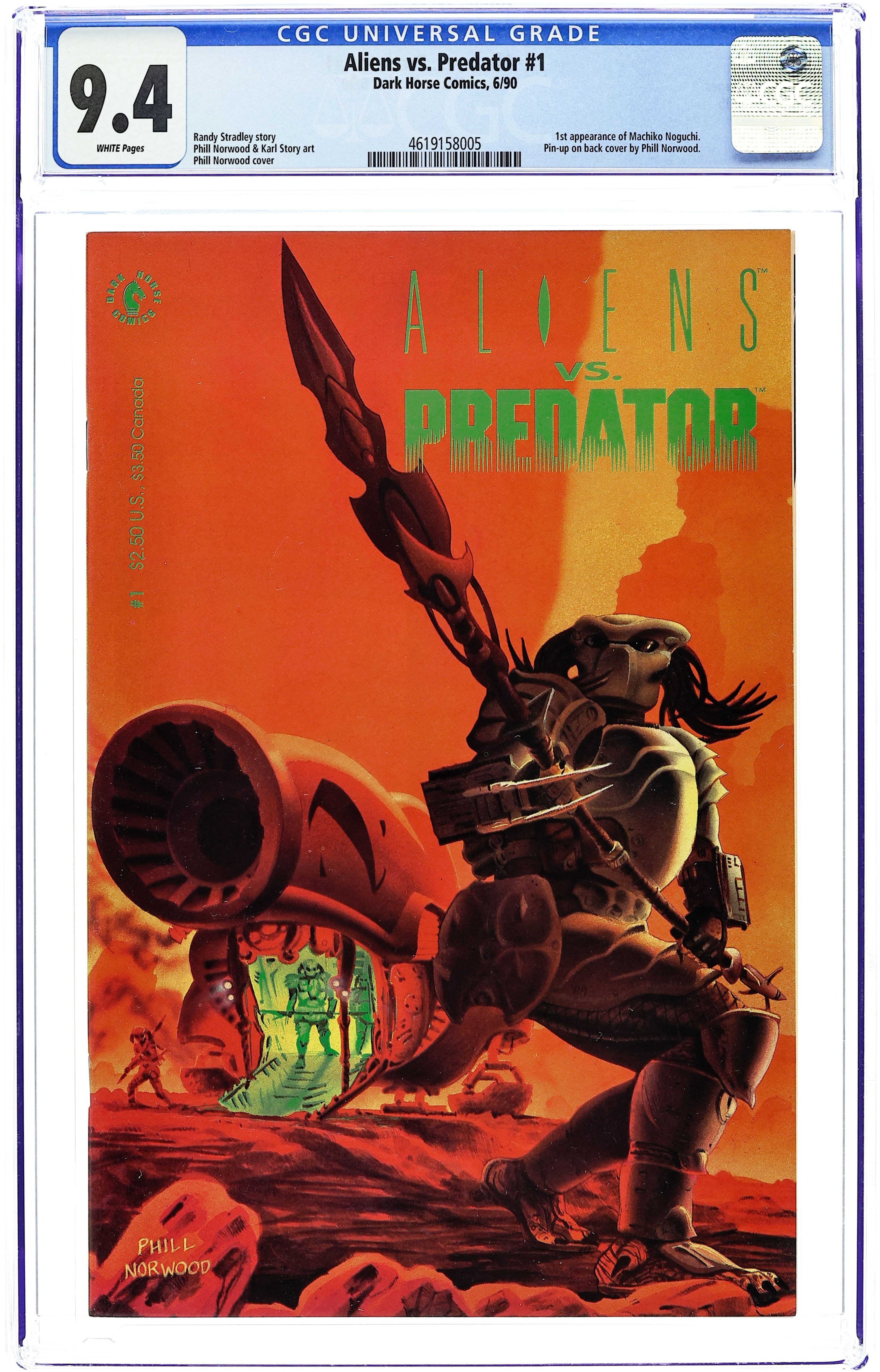 Written by Randy Stradley. Art by Phill Norwood and Karl Story. Cover by Phill Norwood. Continuing the story begun in the pages of Dark Horse Presents #34-#36, this is it--Dark Horse Comics' most ambitious project to date! The inhabitants of the colony planet Ryushi are peaceful ranchers--men and women who lead simple lives. But their lives are tragically shattered as they become part of a "coming of age" ceremony for that race of deadly alien hunters--the Predators. However, the Predators' prey are not the human inhabitants of Ryushi, but rather something far more dangerous--Aliens! Cover price $2.50.