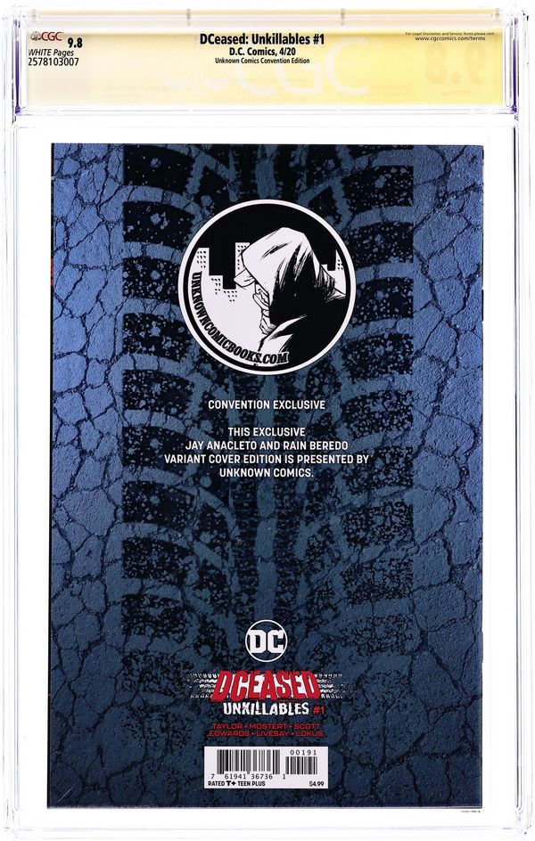 Unknown Comics Convention Exclusive Virgin cover by Jay Anacleto. Written by Tom Taylor. Art by Karl Mostert and Trevor Scott. The blockbuster DC series returns to answer this question: What did the villains do when the heroes failed and the world ended? Spinning out of the dramatic events of 2019's smash hit, writer Tom Taylor returns to this dark world with a street-level tale of death, heroism and redemption. Led by Red Hood and Deathstroke, DC's hardest villains and antiheroes fight with no mercy to save the only commodity left on a dying planet of the undead-life! 48 pages, full color. Rated T+