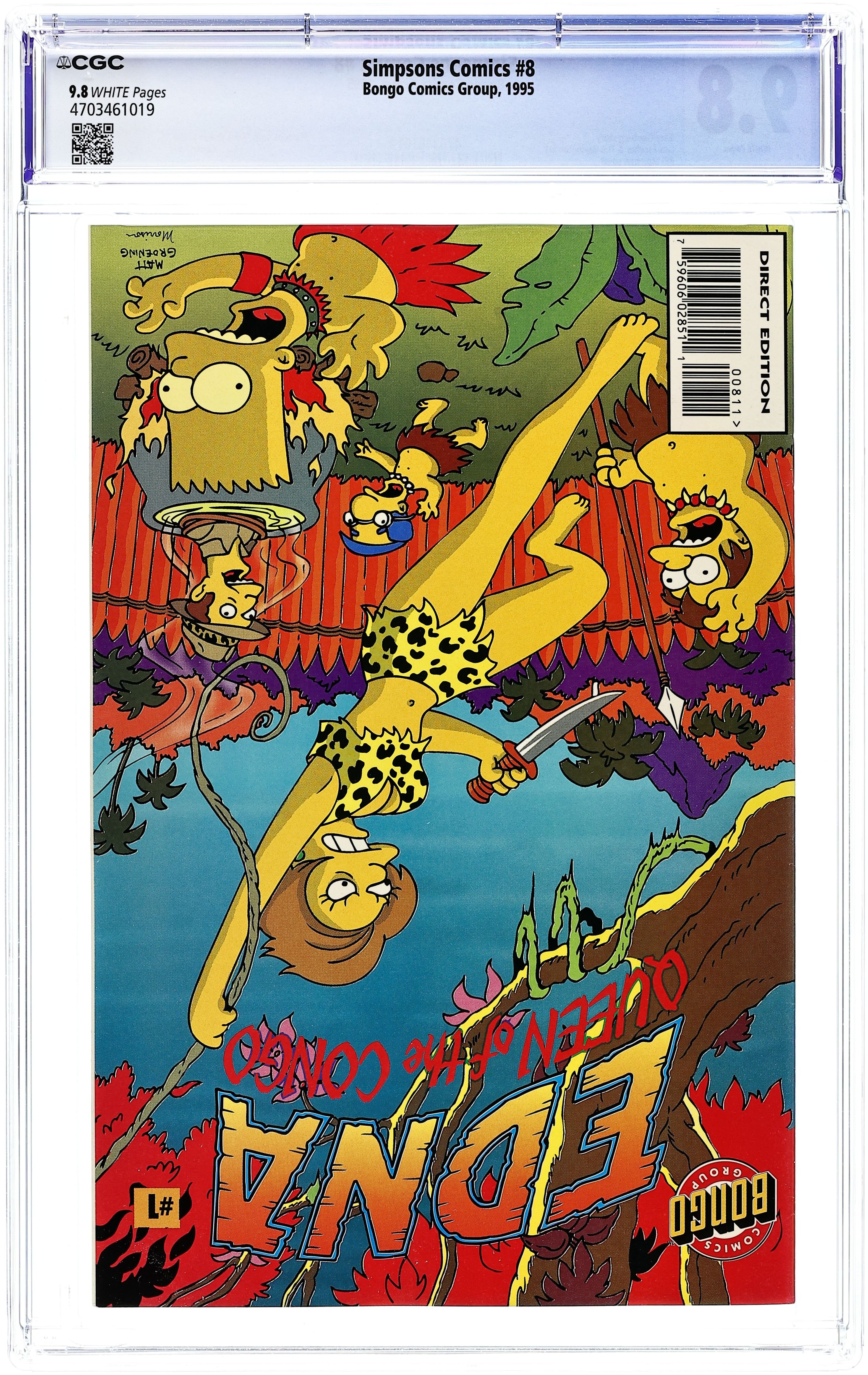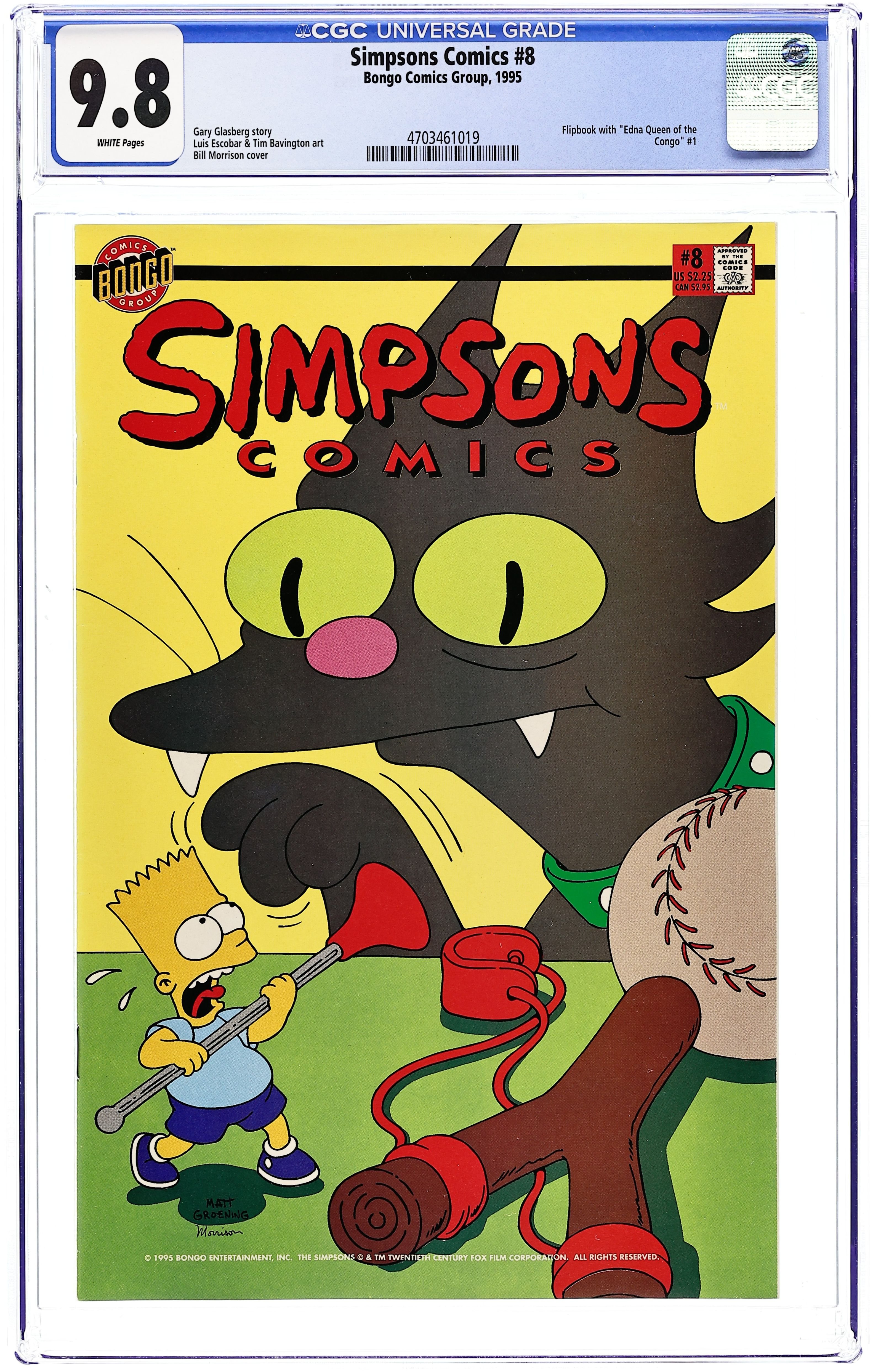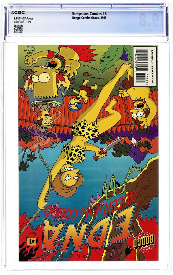 Flip book w/ "Edna, Queen of the Congo #1." Cover art by Bill Morrison. I Shrink, Therefore I'm Small, script by Gary Glasberg, pencils by Luis Escobar, inks by Tim Bavington; Homer is tricked into shrinking down and clearing an internal blockage in Mr. Burns body; Parody of Issac Asimov's Fantastic Voyage story. Matt Groening discusses writing blurbs for cartoonists he digs and gives examples. Bill Morrison biography. Jungle Bungle, script and inks by Bill Morrison, pencils by Bill Morrison (layout) and Luis Escobar; Edna as a Jungle Heroine. 36 pgs. $2.25. Cover price $2.25.