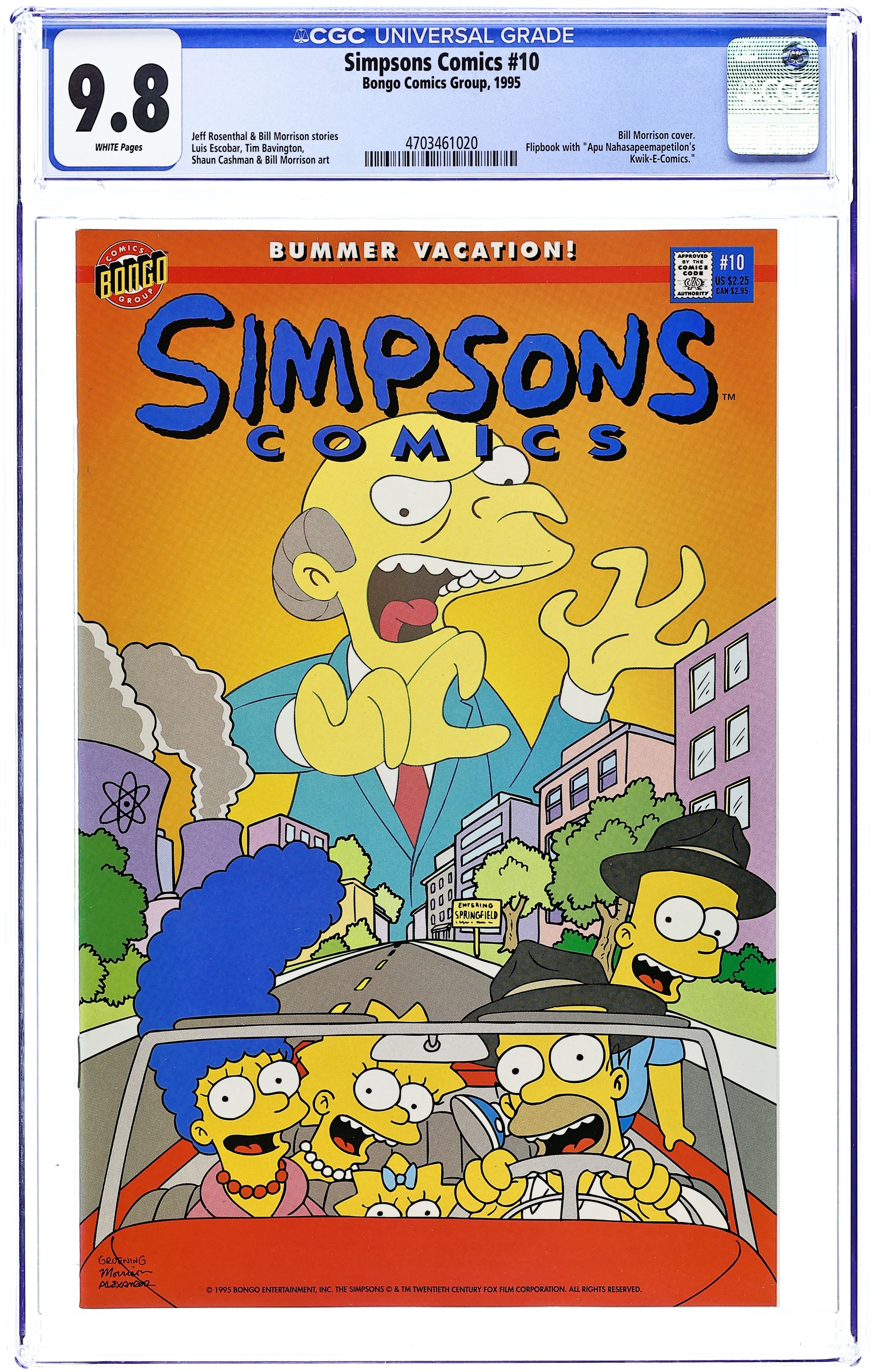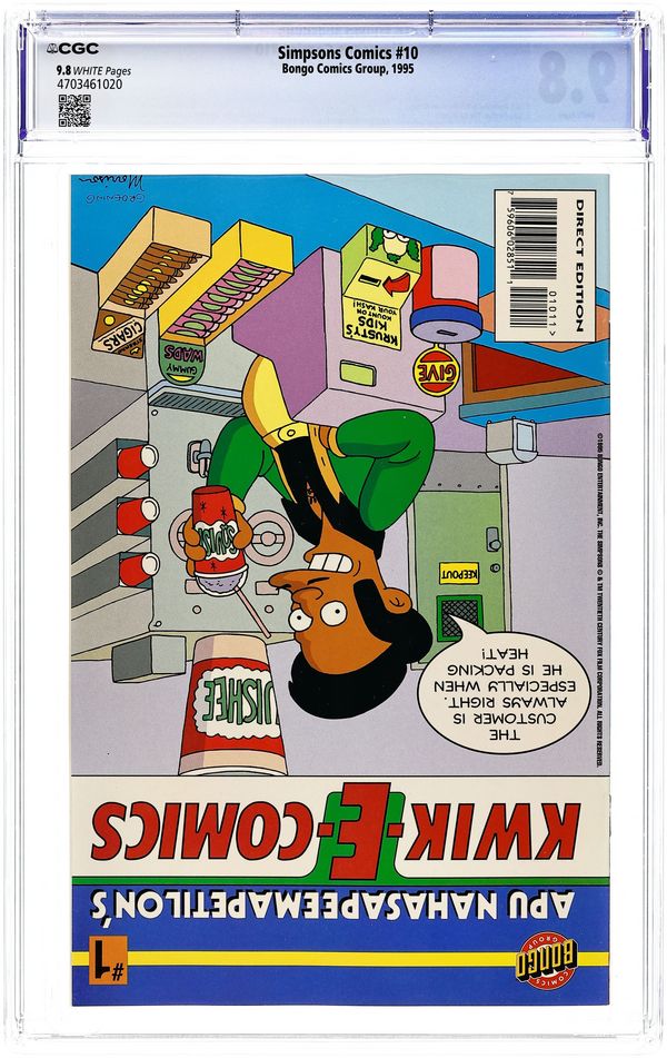 Flip book w/ "Apu Nahasapeemapetilon's Kwik-E-Comics #1." Cover pencils by Bill Morrison, inks by Alexander. Fan-Tasty Island, script by Jeff Rosenthal, pencils by Luis Escobar (Layouts) and Tim Bavington (Pencils), inks by Tim Bavington, Bill Morrison, Robert Kramer, and David Mowry; Mr. Burns uses the Simpsons to smuggle a secret energy source into the country. Matt Groening talks about the bad haircuts he used to get as a child. Apu's Incredible 96 Hour Shift (Without Having a Break!), script by Bill Morrison, art by Shawn Cashman; Apu is trapped inside the Kwik-E-Mart for 96 hours, with a wanted man. 36 pgs. $2.25. Cover price $2.25.