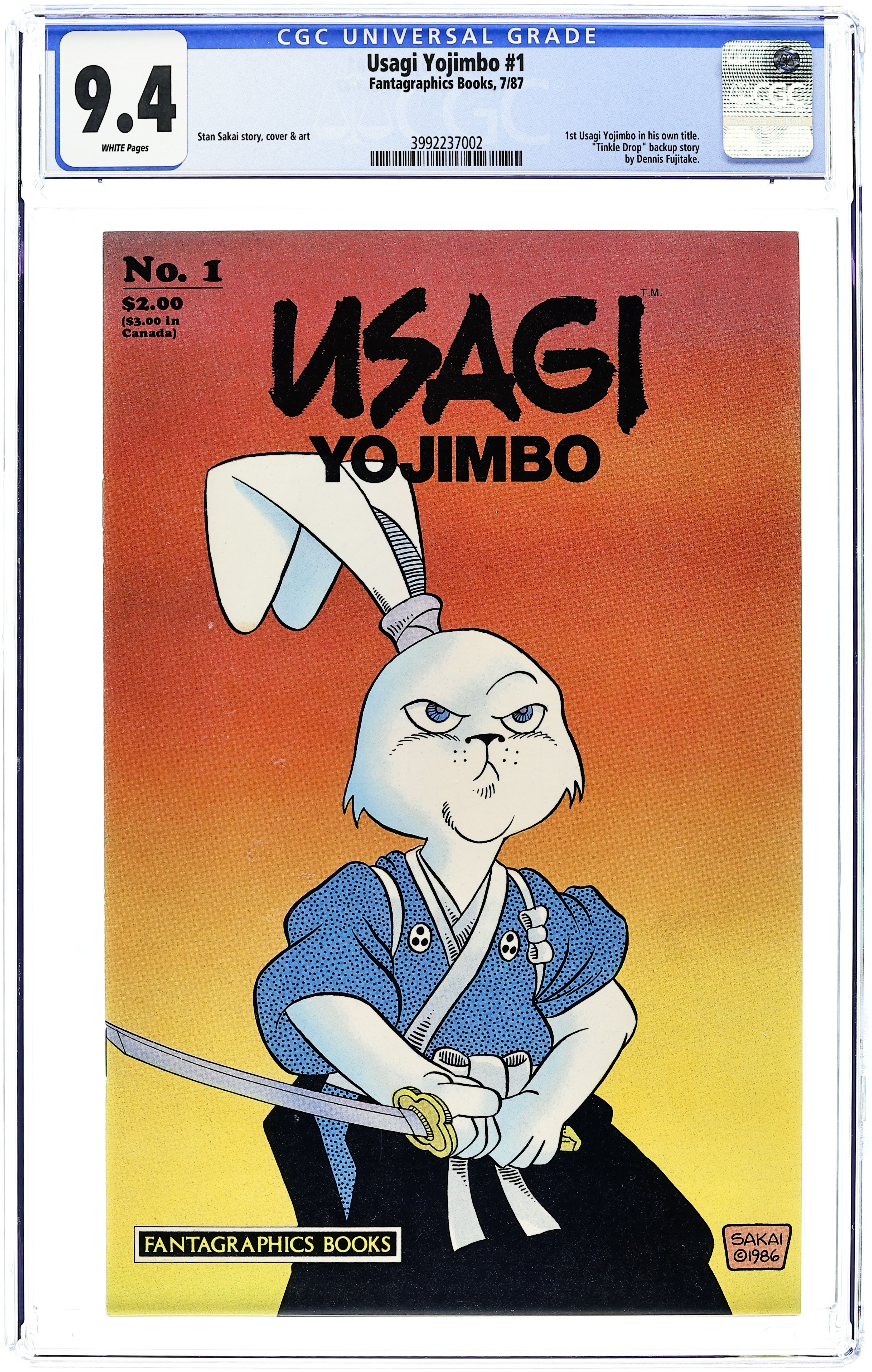First printing. A duel puts Stan Sakai's rabbit samurai in an introspective mood, and he recalls his early combat training with the lion-maned Sensei Katsuichi. Parts 1 and 2 of Samurai. Story, art and cover by Sakai, plus Waddlewalk by Dennis Fujitake. Black and white; 32 pages. Other titles featuring Usagi Yojimbo include Albedo, Doomsday Squad #3 and Space Usagi. NOTE: Some issues from #1-10 were reprinted. Reprints are so noted in the reprint edition's indica. Cover price $2.00.
