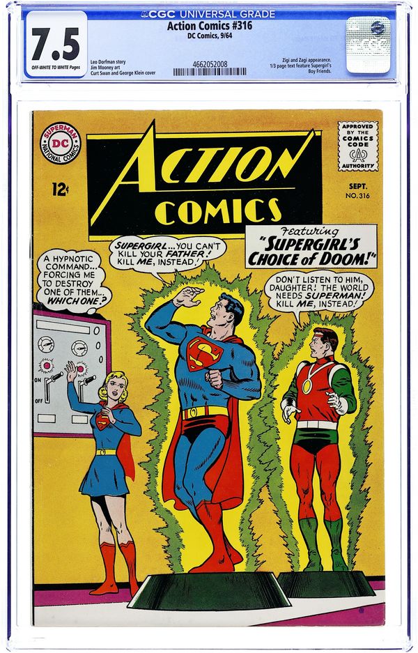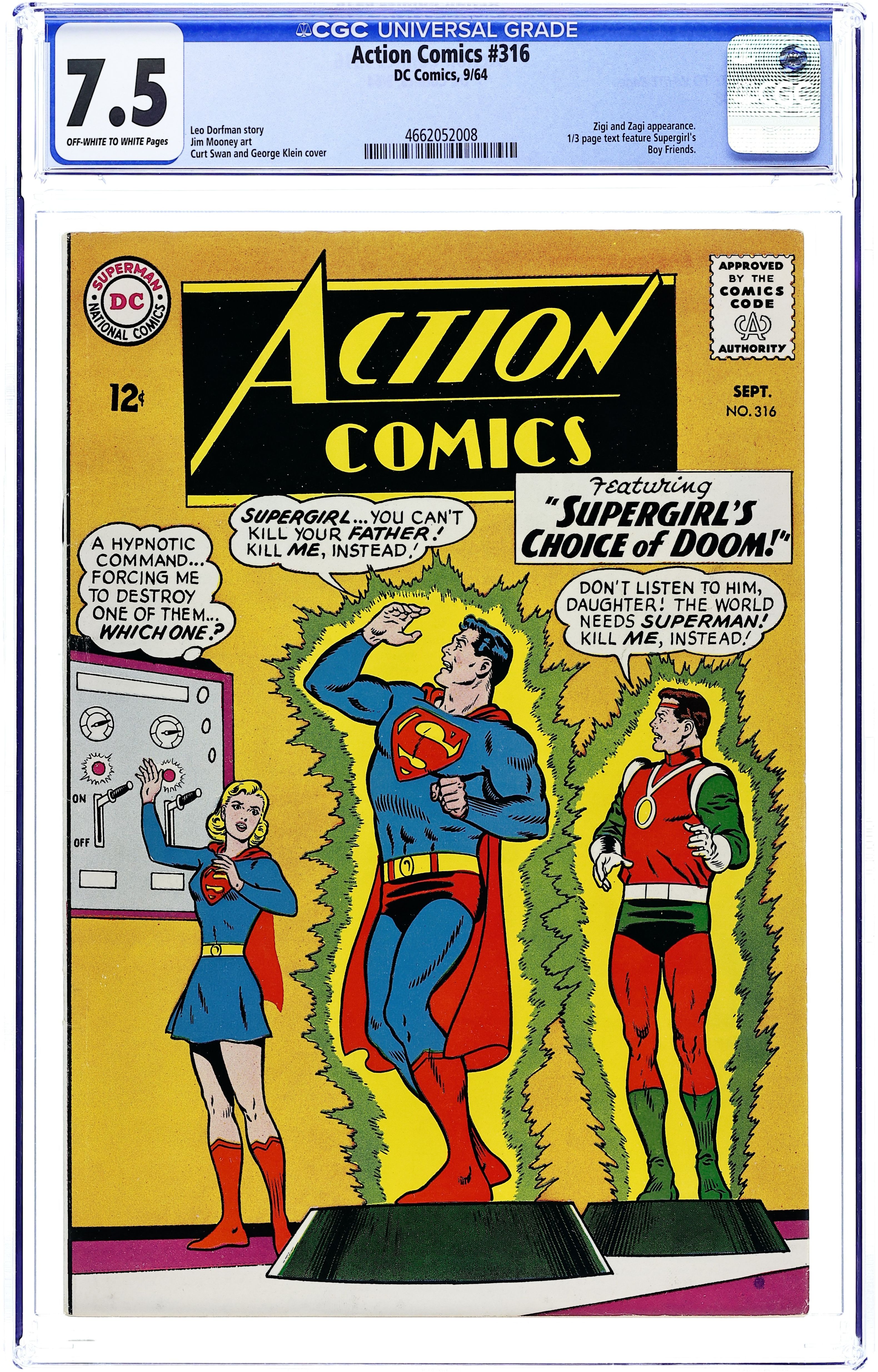 Cover pencils by Curt Swan, inks by Stan Kaye. "The War Between Supergirl and the Supermen Emergency Squad!", script by Robert Bernstein, pencils by Wayne Boring, inks by Stan Kaye; John Kiley tricks Superman into revealing he's Clark Kent; After trapping Clark Kent with Kryptonite, Supergirl and the Superman Emergency Squad spring into action. One-page Varsity Vic story by Henry Boltinoff. 1st appearance of Brainiac 5, Phantom Girl, Triplicate Girl, Bouncing Boy, Sun Boy, and Shrinking Violet in "Supergirl's Three Super Girl-Friends!", script by Jerry Siegel, art by Jim Mooney; Supergirl and Brainiac 5 join the Legion. 36 Pages, Full Color. $.10 Cover price $0.10.