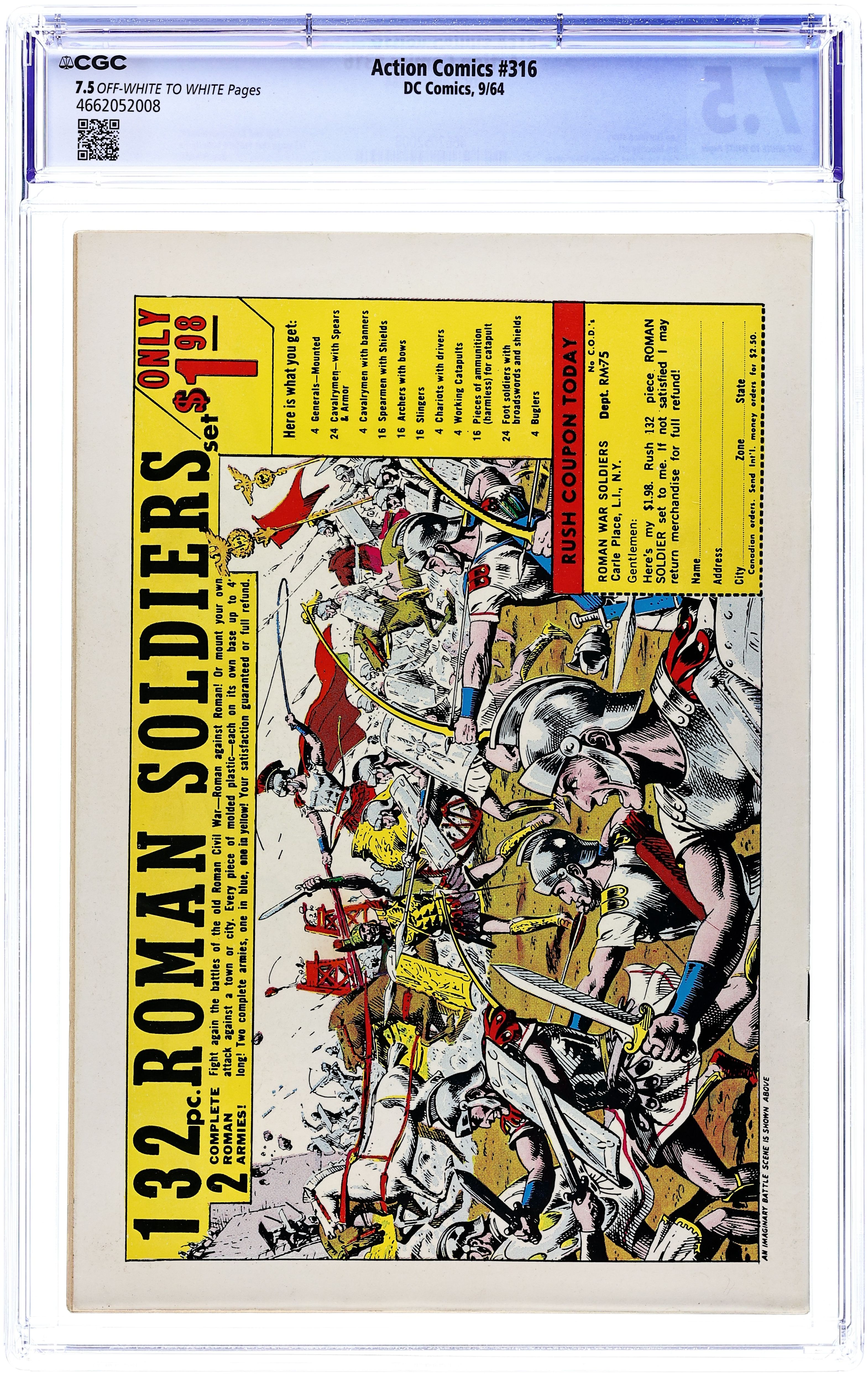 Cover pencils by Curt Swan, inks by Stan Kaye. "The Oldest Man in Metropolis!", script by Robert Bernstein, pencils by Al Plastino, inks by Al Plastino; When Clark Kent drinks Prof. Vance's life-extending vitamin serum, which contains particles of Kryptonite, it ages him to about 70 years old; Since his robots won't respond to his aged voice, Superman must fulfill his duties as the Old Man of the Sea, Santa Claus, and Father Time so that no one realizes that Clark Kent is Superman. Introducing the Girl of Steel ad for Supergirl. "Congorilla, Outlaw!", script by Robert Bernstein, art by Howard Sherman. -page Peg story by Henry Boltinoff. Supermen of America ad. "The Giant Amoeba of Space!", script by Otto Binder, art by Jim Mooney; Tommy and the Planeteers battle a giant space amoeba. 36 Pages, Full Color. $.10 Cover price $0.10.