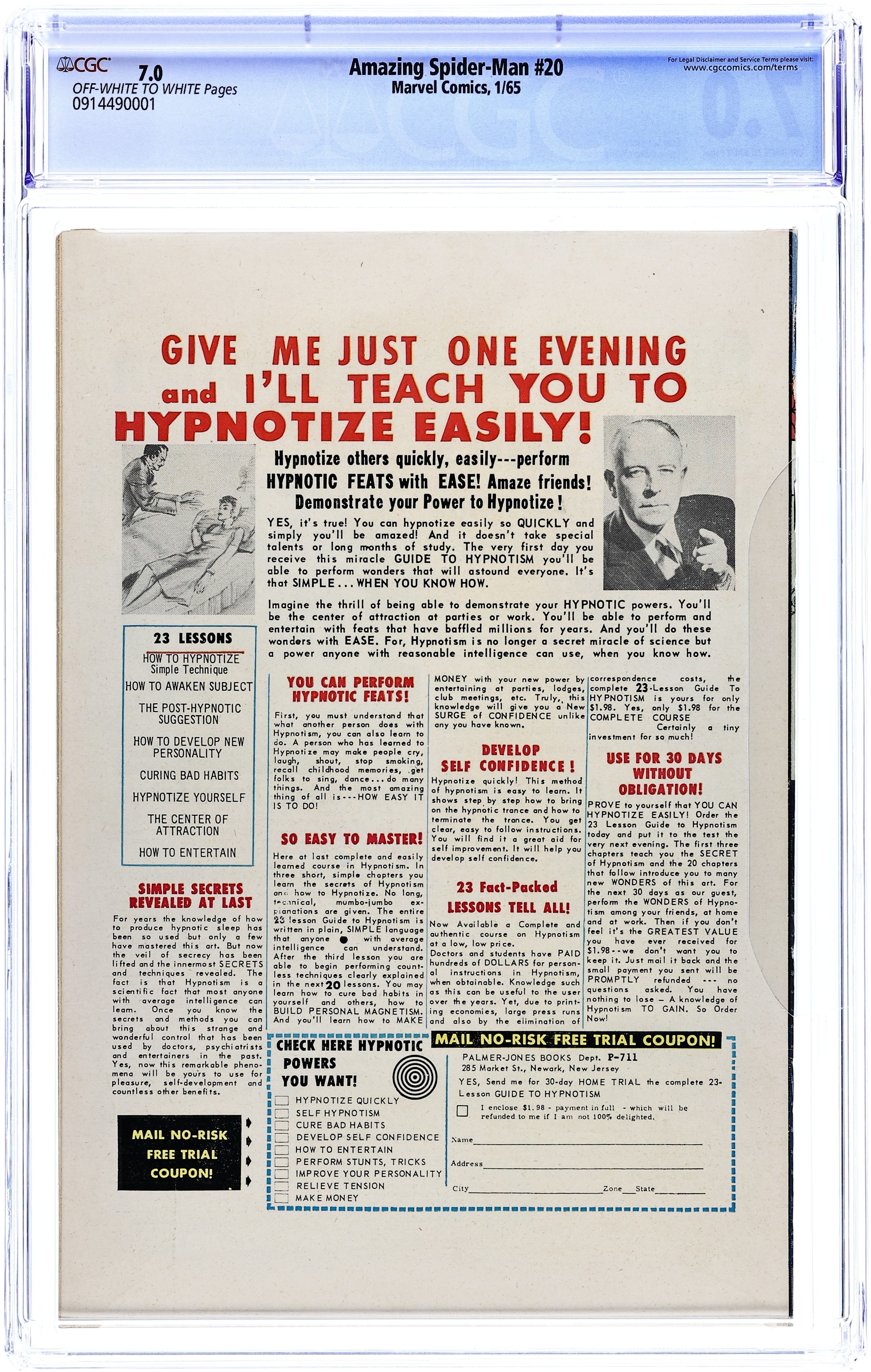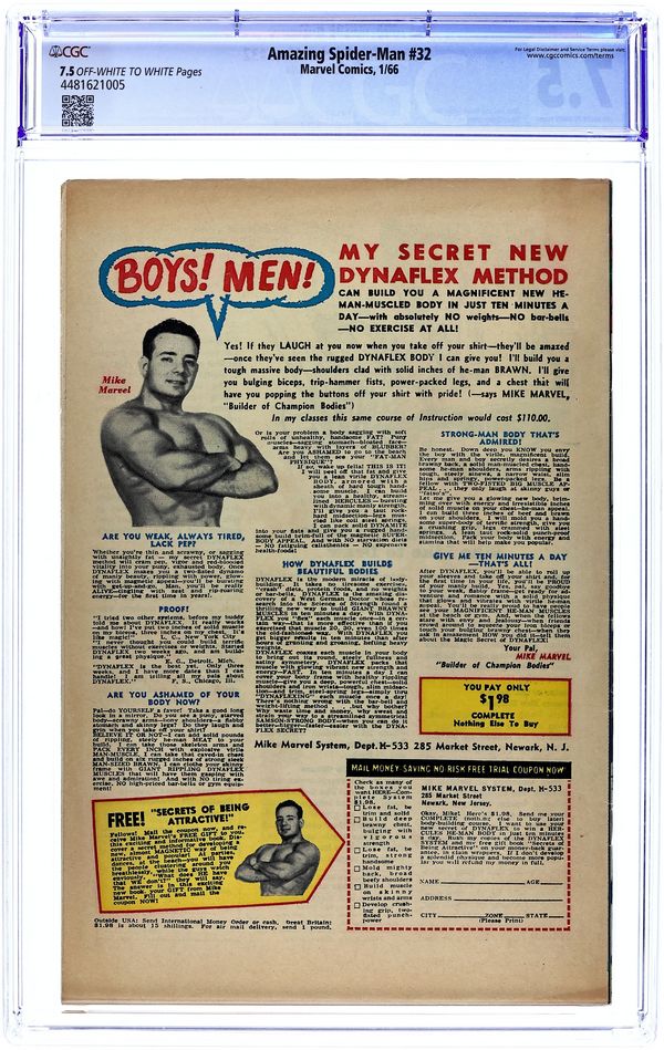 Spider-Man goes to see a psychiatrist! But it's really Mysterio messing with Spidey's mind in "Spider-Man Goes Mad." Script by Stan Lee, art and cover by Steve Ditko. Cameos (actually part of Spider-Man's imagination) by Doctor Octopus, the Vulture, and the Sandman. Reprinted in Marvel Tales # 19 and 162. Letters to the editor from comics writer Don McGregor and mycomicshop.com president Buddy Saunders! 36 pgs. Cover price $0.12.