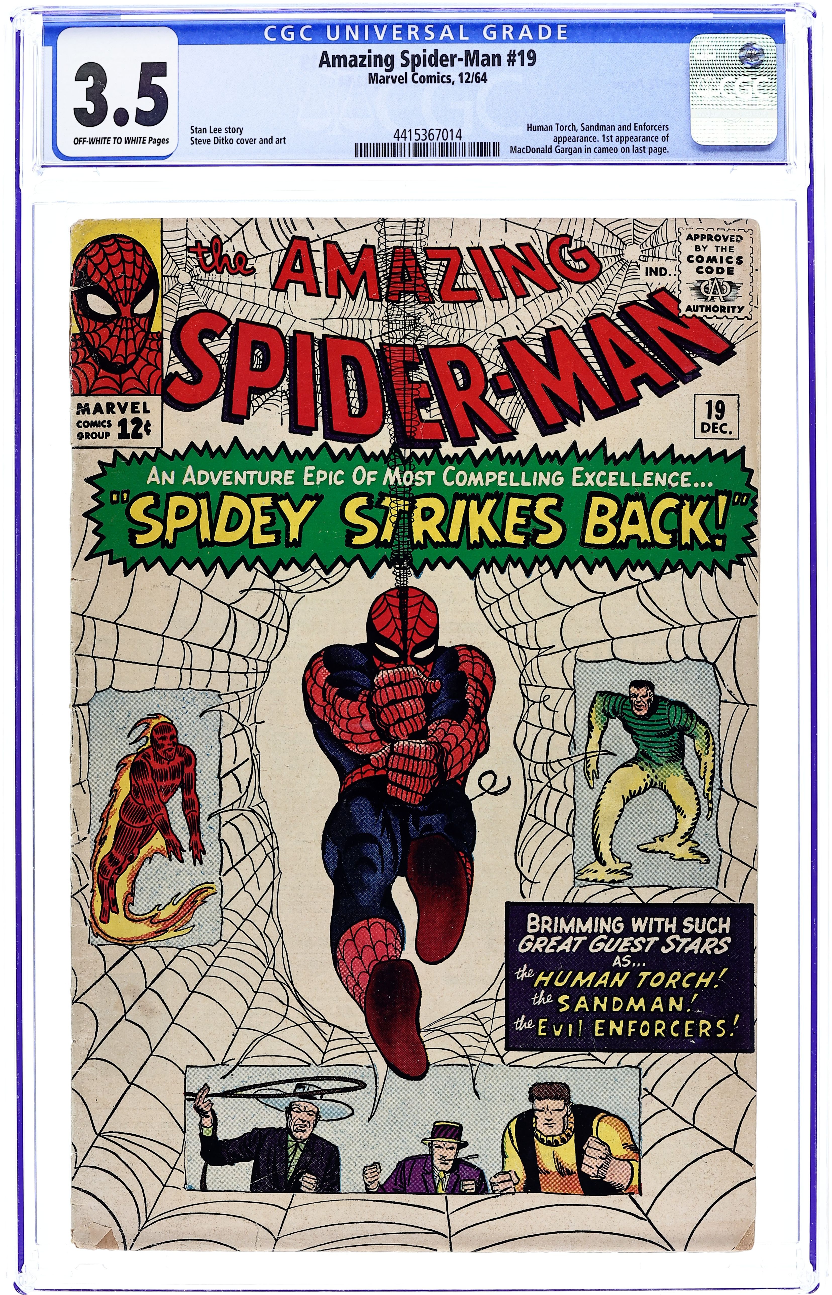 Cover art by Steve Ditko. Spidey Strikes Back!, script by Stan Lee, art by Steve Ditko; Sandman and the Enforcers capture the Human Torch; When Spider-Man questions a stool pigeon and learns of this he comes to the aid of the Human Torch. Second appearance of Ned Leeds (future Hobgolin) in this issue (first time his name is revealed). Reprinted in Marvel Tales # 14 and 157. 36 pgs. $0.12. Cover price $0.12.