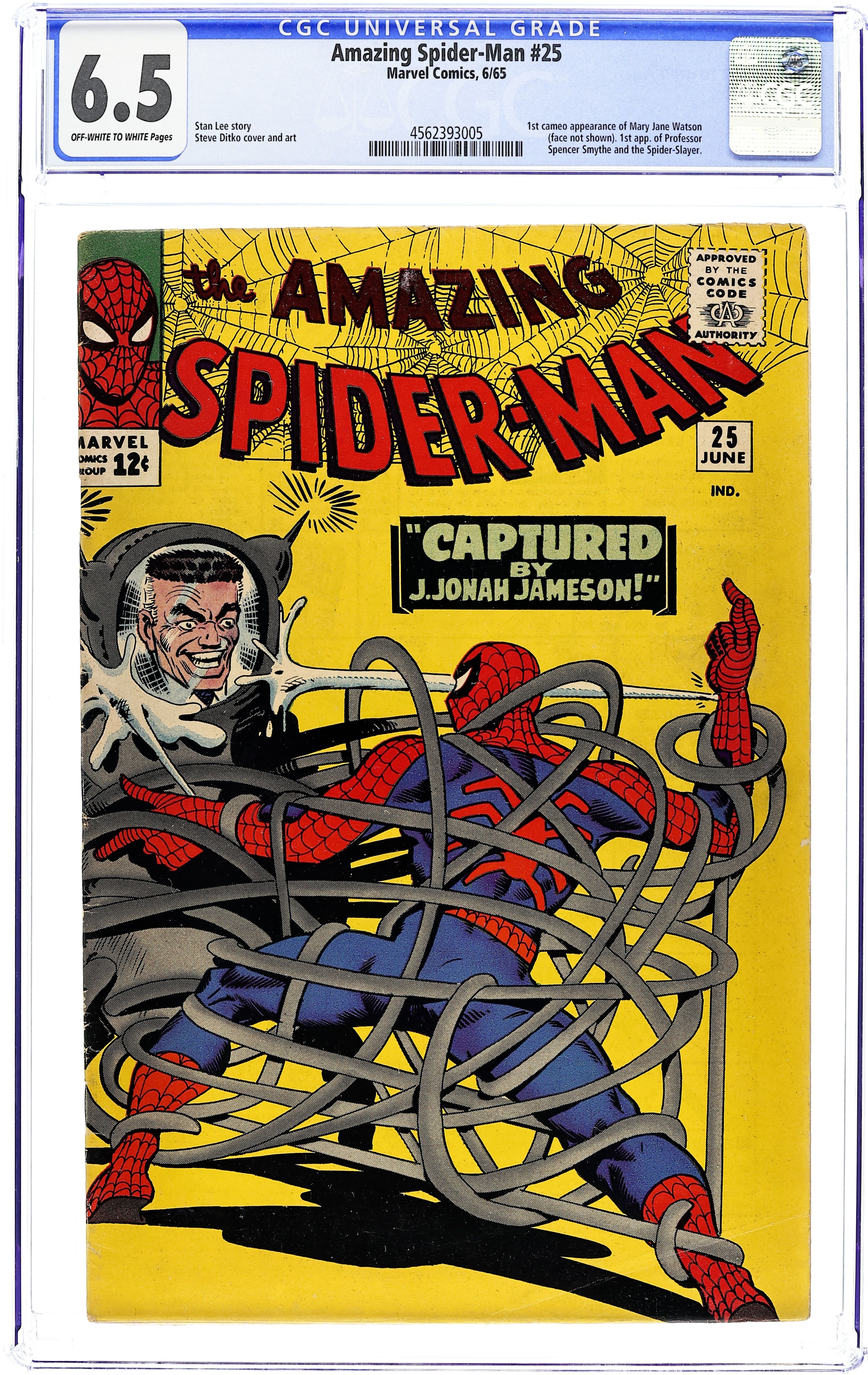 Starts Apr 4 Cover art by Steve Ditko. First appearance of Mary Jane Watson (cameo; face not shown) in "Captured by J. Jonah Jameson," script by Steve Ditko (plot) and Stan Lee (script), art by Steve Ditko; As Peter goes to sell pictures of a crime to J. Jonah Jameson, an inventor named Smythe comes in with a robot guaranteeing the destruction of Spider-Man; Since Peter needs money bad, he eggs Jameson on to hear out the wacky inventor; Smythe shows how his robot instantly shoots out steel tentacles at the hint of a spider's presence and grabs a hold of Peter, much to his surprise; Jameson is given a remote control and they agree to a deal; Betty is furious with Peter for trying to trap Spider-Man, not understanding his true reasons; Peter shows up at school and has Flash Thompson waiting to fight him as he hangs around Liz Allan too much to his liking; As Peter exits school, he sees the robot and begins to run; Flash, thinking he's running away from a fight runs after Peter; First appearance of Spencer Smythe and the Spider Slayer Mark I. Reprinted in Marvel Tales #20 and #163. 36 pgs., full color. Cover price $0.12.