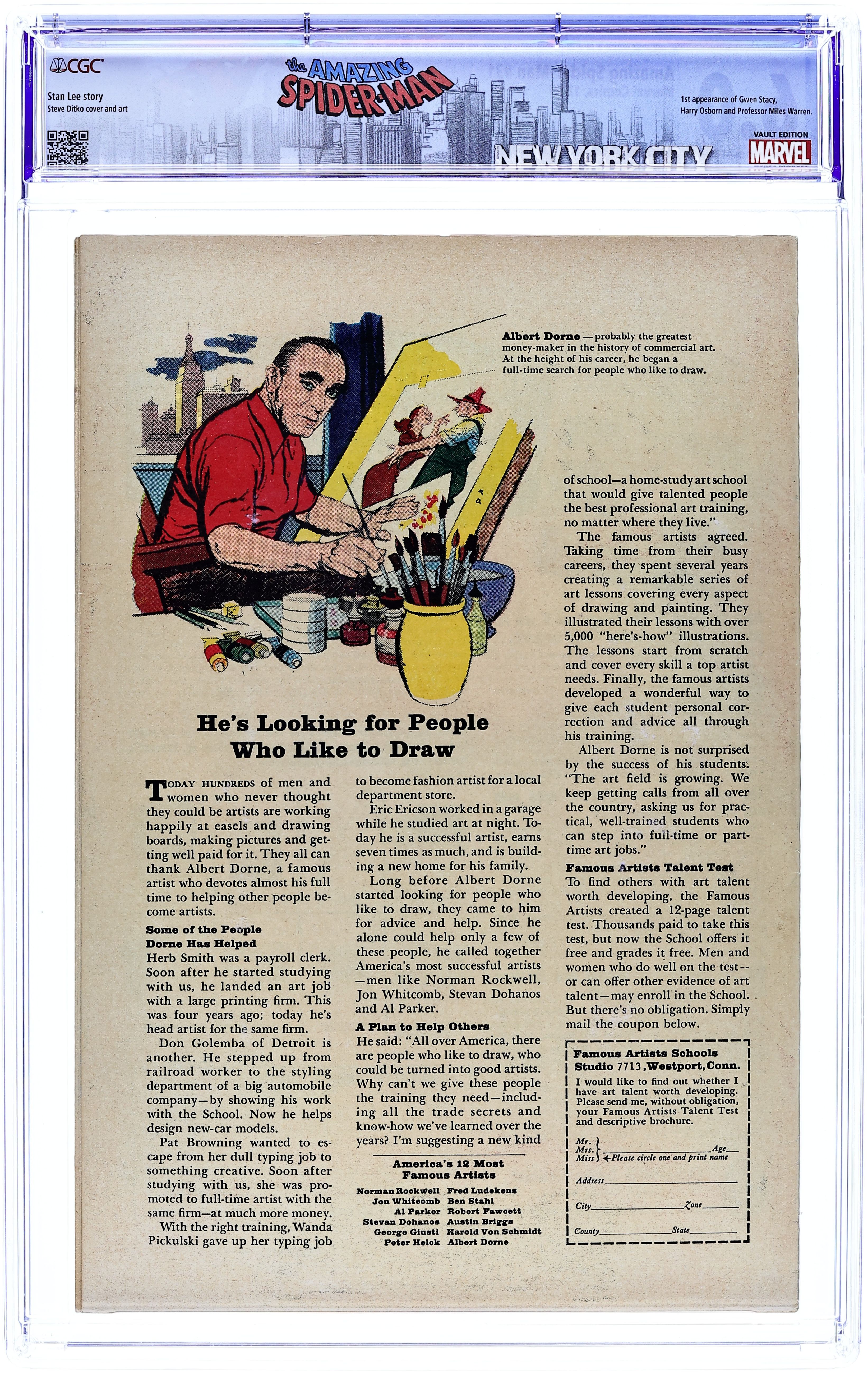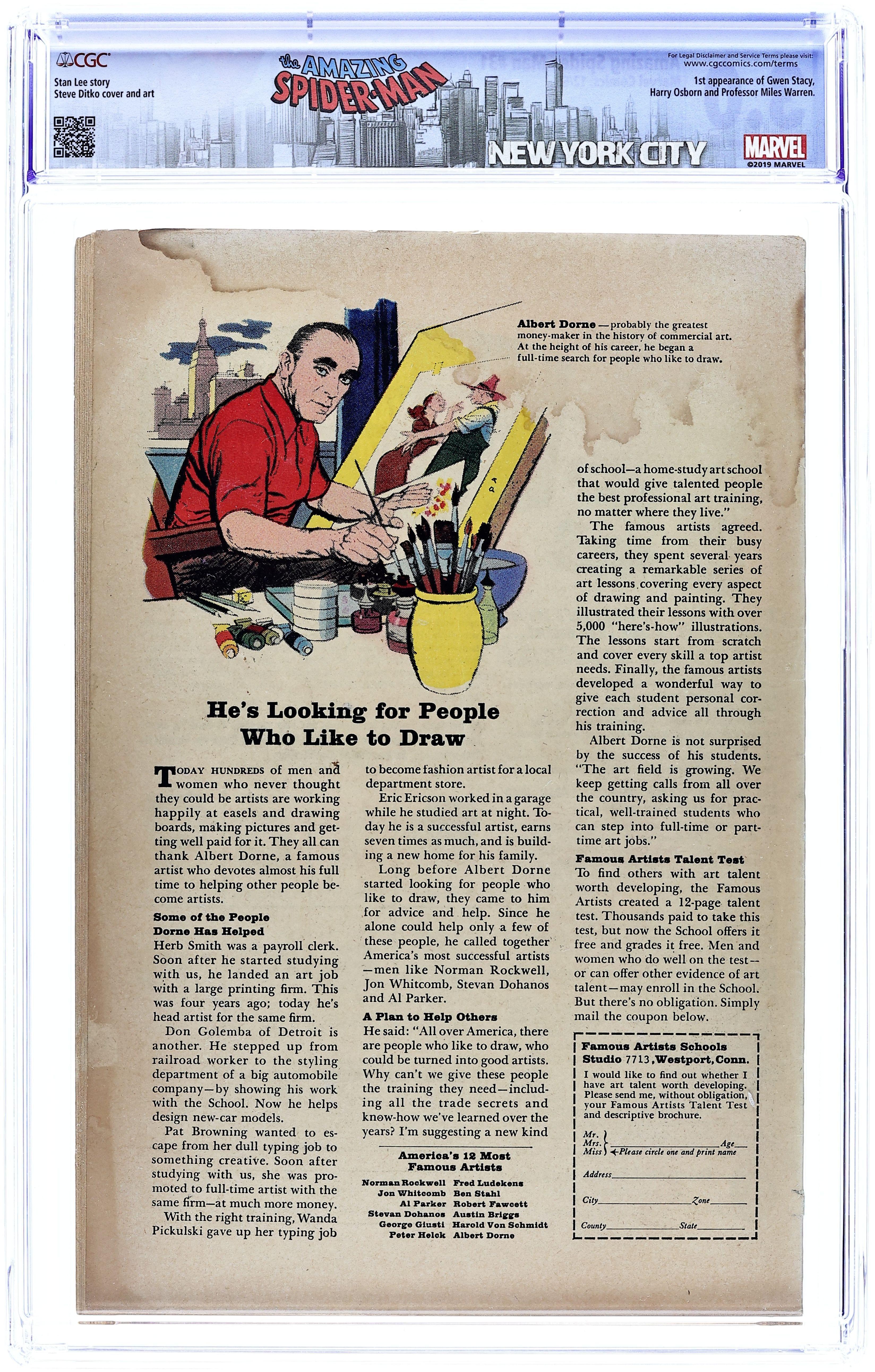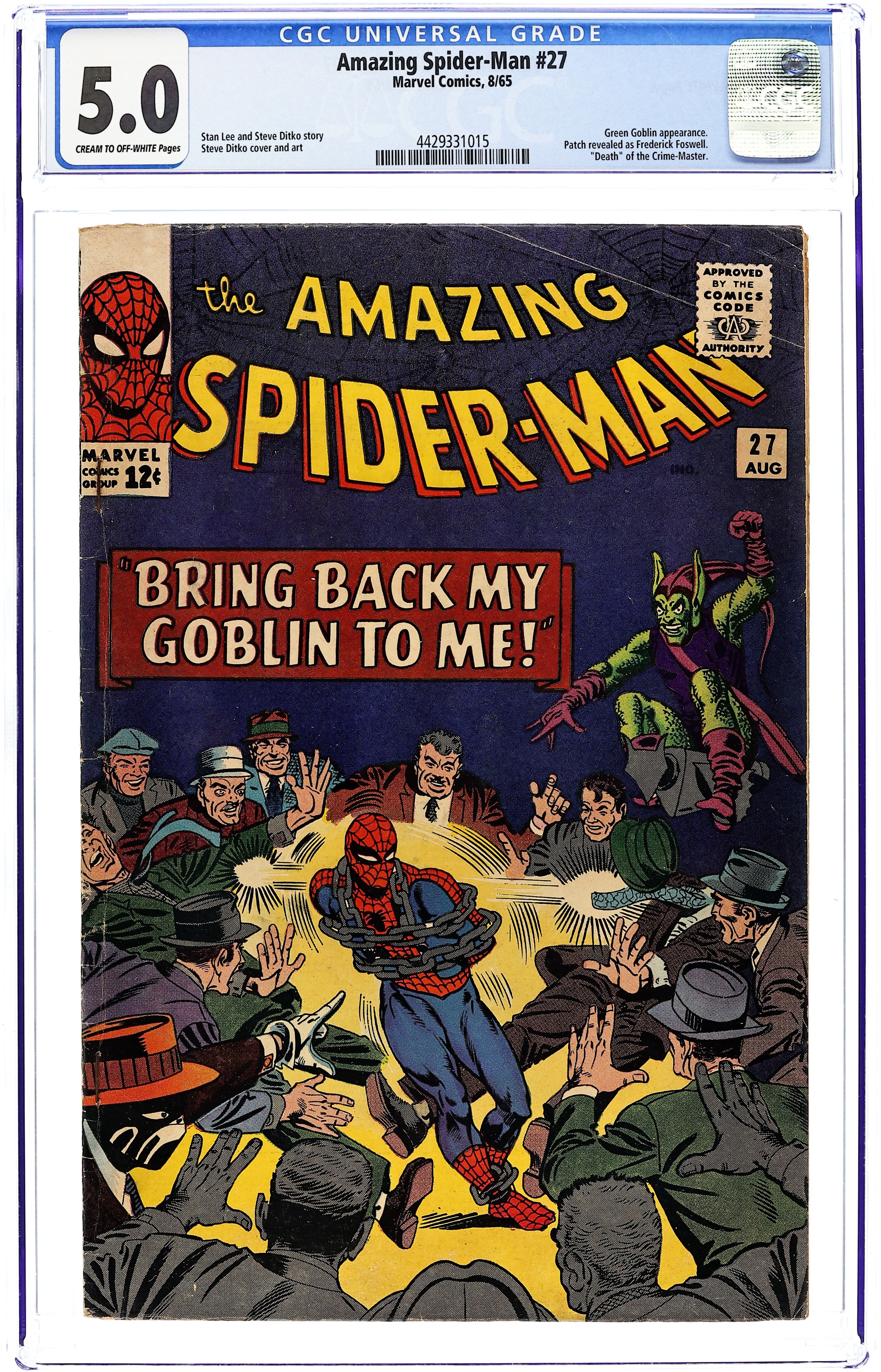 Cover art by Steve Ditko. Third appearance of the Sandman in The End of Spider-Man!, script by Stan Lee, art by Steve Ditko; With the entire city thinking he is a coward, Spider-Man runs from Sandman; Peter's life is in shambles, and he contemplates giving up being Spider-Man to concentrate on his personal life; Cameos by the Avengers, Daredevil, the Fantastic Four, the Green Goblin, Kraven the Hunter, Doctor Octopus, and the Vulture. First appearance of Ned Leeds (later Hobgoblin). Reprinted in Marvel Tales # 13 and 156. Letter to the editor from comics artist Frank Brunner. 36 pgs. $0.12. Cover price $0.12.