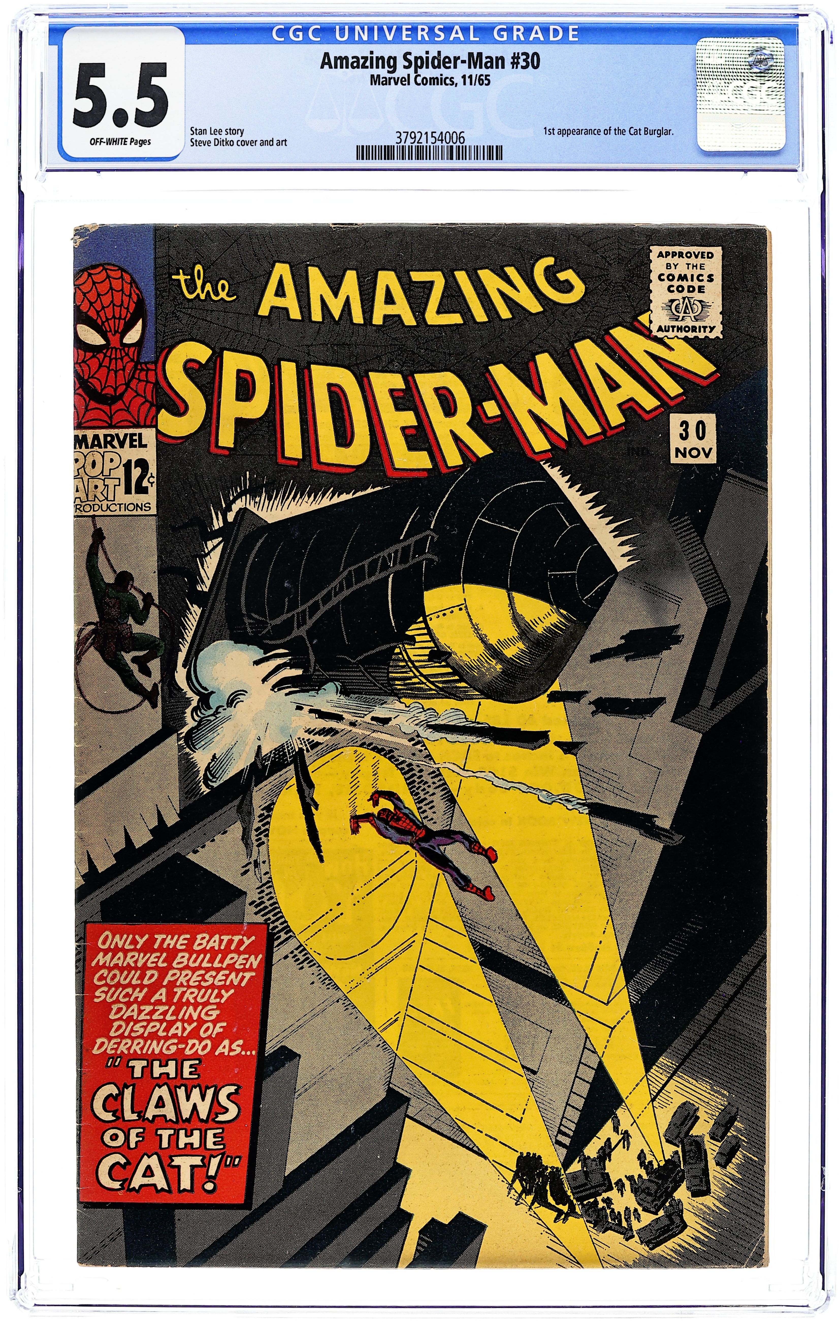 Cover by Steve Ditko. First appearances of Gwen Stacy, Harry Osborn, and Professor Warren. First appearance of the Master Planner (revealed in issue 32 to be Doctor Octopus) in "If This Be My Destiny, script by Steve Ditko (plot) and Stan Lee (script), art by Steve Ditko; Aunt May falls deathly ill on Peter's first day of college. Meanwhile, the Master Planner is stealing scientific gadgets. Marvel Bullpen Bulletins, art by Steve Ditko and Marie Severin; Bullpen Bulletins page discussing staff; Marvel Checklist; ads for Spider-Man T-Shirt and MMMS. Letter to the editor from comics writer Don McGregor. Reprinted in Marvel Tales # 24 and 170. 36 pgs., full color. $0.12. Cover price $0.12.