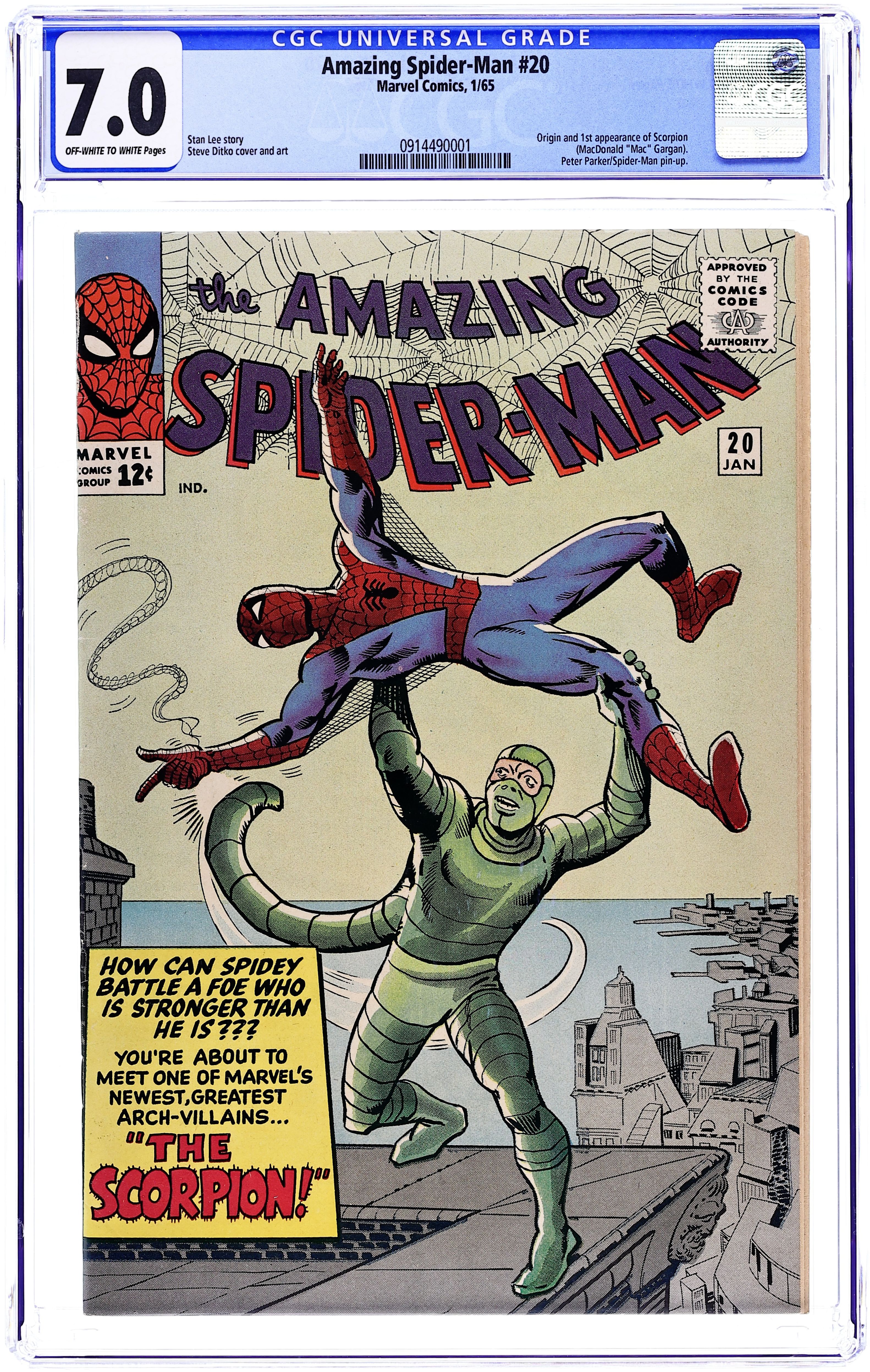 Cover art by Steve Ditko. First appearance of the Scorpion in The Coming of the Scorpion!, script by Stan Lee, art by Steve Ditko; J. Jonah Jameson pays Dr. Stillwell to turn Mac Gargan into the Scorpion to try to capture Spider-Man. Stillwell's formula makes Gargan become more evil than he originally was and the Scorpion goes on a rampage and is finally stopped by Spider-Man. Reprinted in Marvel Tales # 15 and 158. 36 pgs. $0.12. Cover price $0.12.
